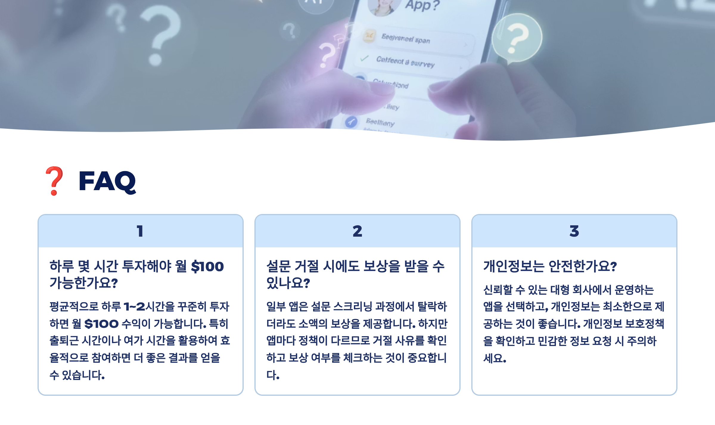 마지막으로, 설문앱은 본업을 대체할 수 있는 수입원은 아니에요. 하지만 용돈벌이나 생활비 보조 수단으로는 충분히 가치가 있어요. 특히 학생이나 주부, 은퇴자분들에게는 좋은 부수입원이 될 수 있죠. 중요한 건 꾸준함이에요. 매일 조금씩이라도 하다 보면 어느새 목돈이 모여 있을 거예요! 💪