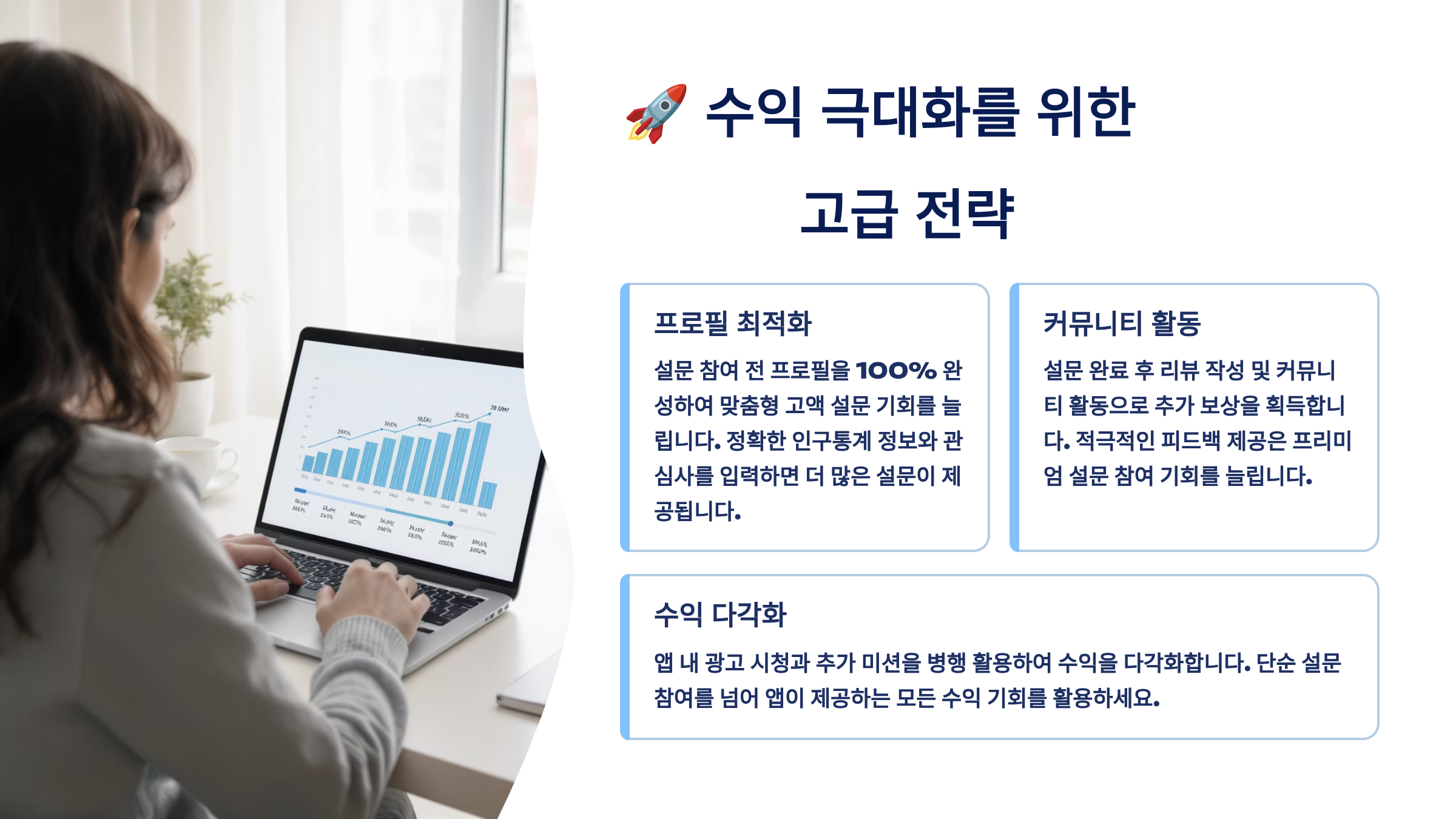각 앱마다 정기적으로 보너스 이벤트를 진행해요. '이번 주 10개 설문 완료 시 5,000원 추가 지급' 같은 이벤트죠. 이런 이벤트 기간에 집중적으로 활동하면 평소보다 50% 이상 더 벌 수 있어요. 저는 이벤트 캘린더를 만들어서 관리하고 있어요.