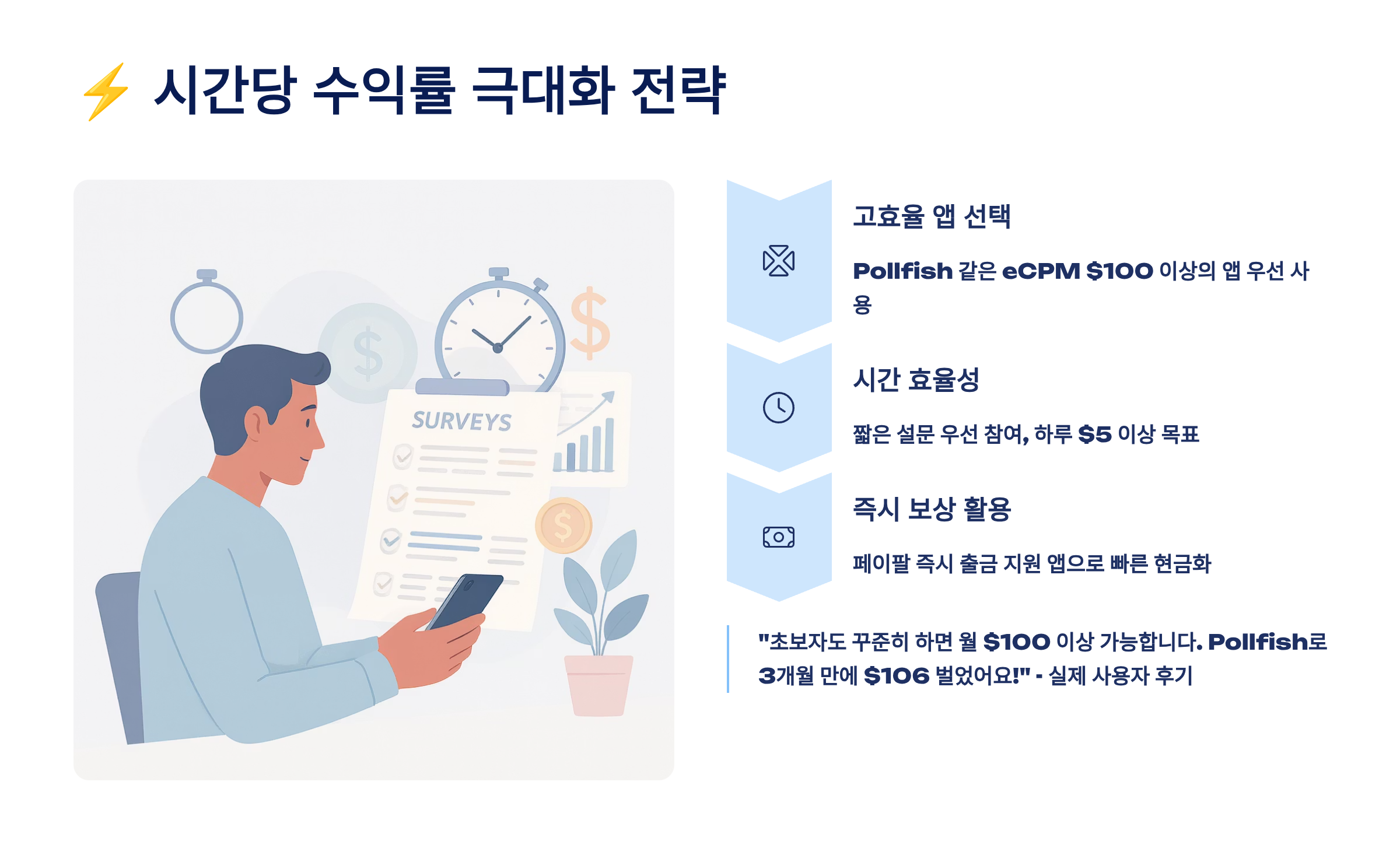 설문앱으로 돈을 벌 때 가장 중요한 건 '효율성'이에요. 같은 시간을 투자해도 전략에 따라 수익이 2~3배 차이 날 수 있거든요. 제가 2년간 시행착오를 겪으며 터득한 시간당 수익률을 극대화하는 노하우를 모두 공개할게요. 이 전략들만 잘 활용해도 월 수익을 50% 이상 늘릴 수 있을 거예요! ⚡