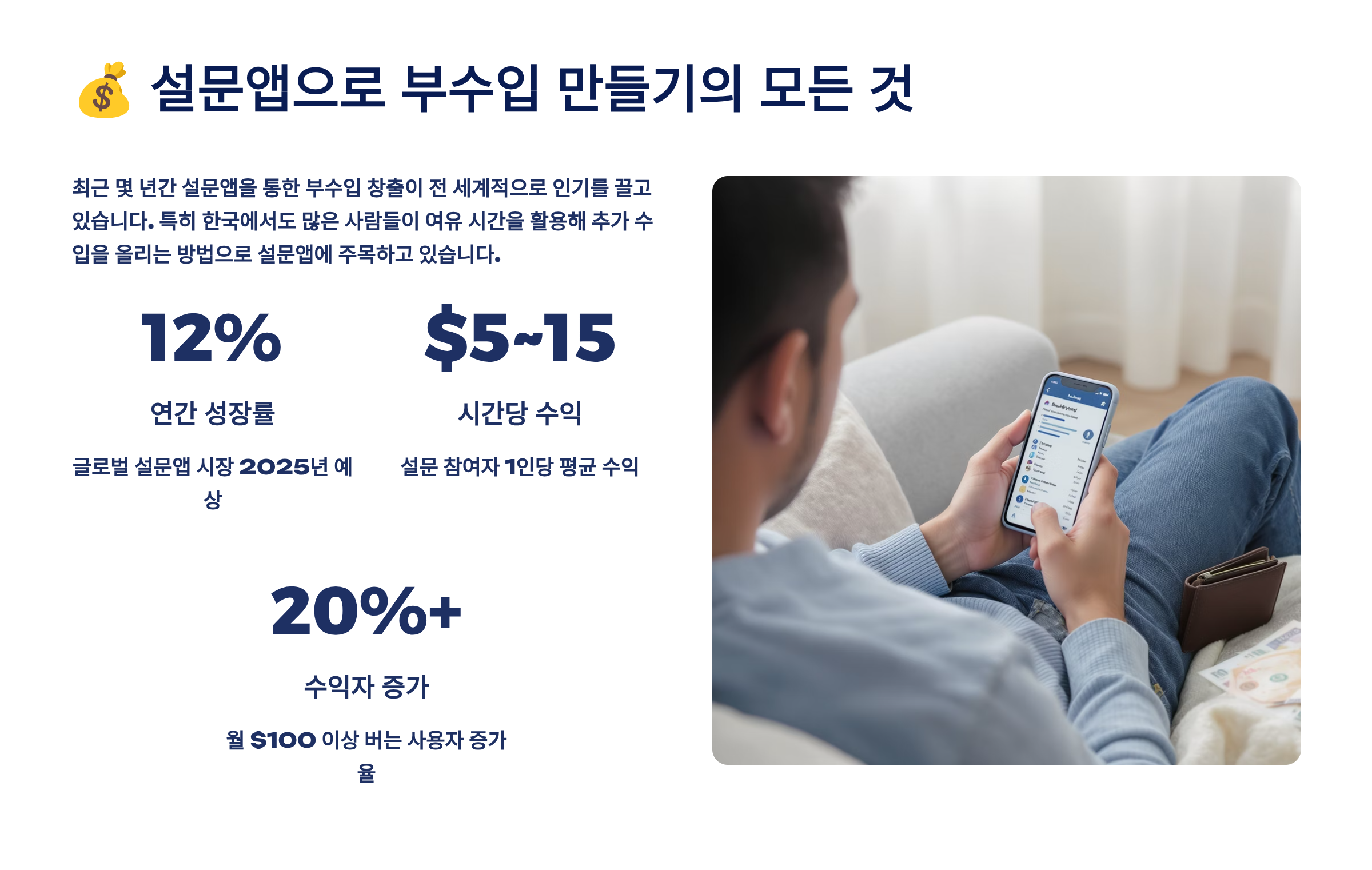 설문앱이란 기업이나 연구기관에서 소비자 의견을 수집하기 위해 만든 플랫폼이에요. 우리가 설문에 참여하면 그 대가로 포인트나 현금을 받을 수 있죠. 예전에는 길거리에서 직접 설문조사를 했지만, 이제는 스마트폰으로 언제 어디서나 참여할 수 있게 되었어요. 정말 편리한 시대가 되었죠? 😊