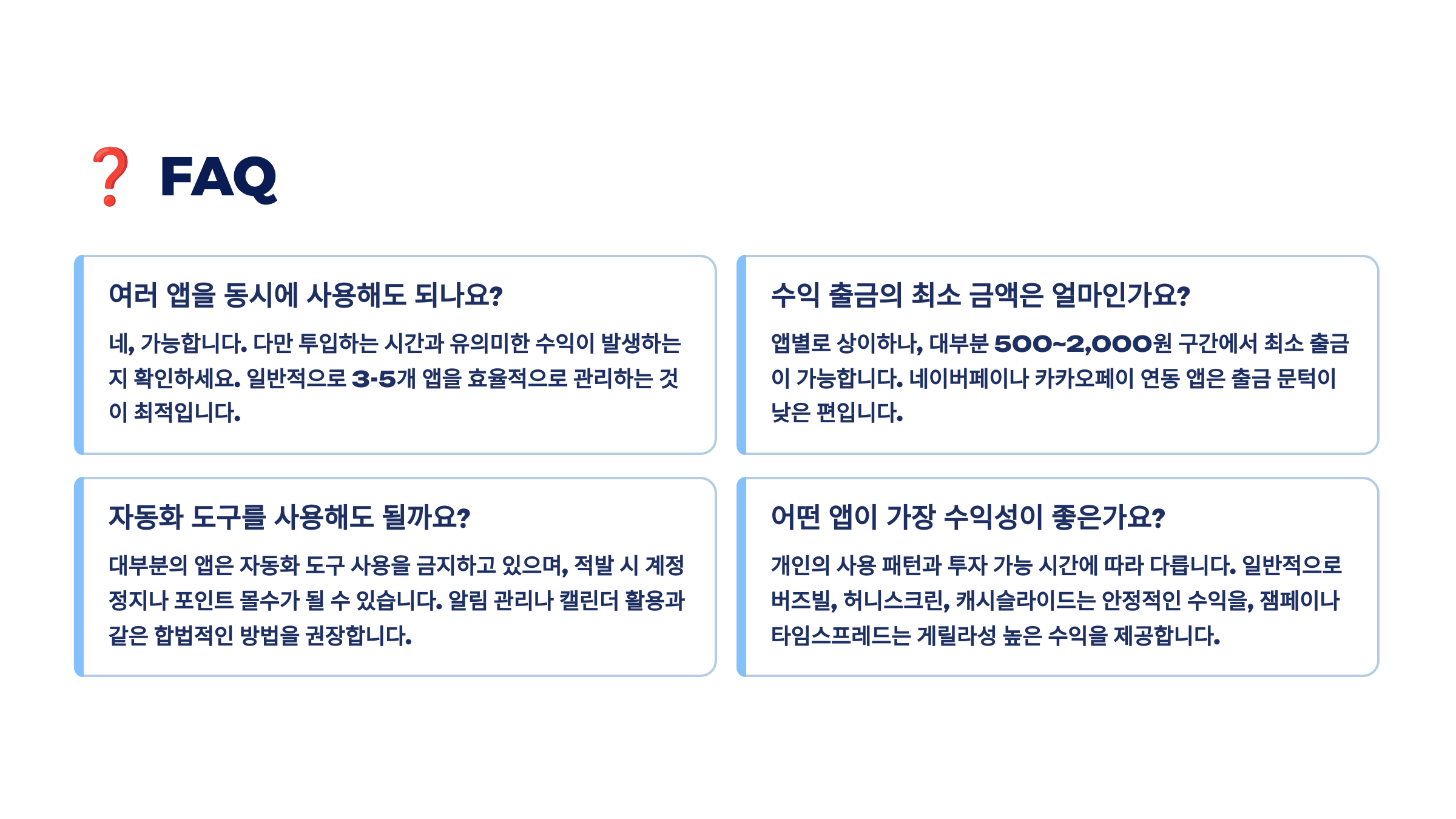 A3. 초보자라면 캐시슬라이드나 허니스크린부터 시작하세요. 사용법이 간단하고 꾸준한 수익을 낼 수 있어요. 익숙해지면 다른 앱도 추가하면 됩니다.