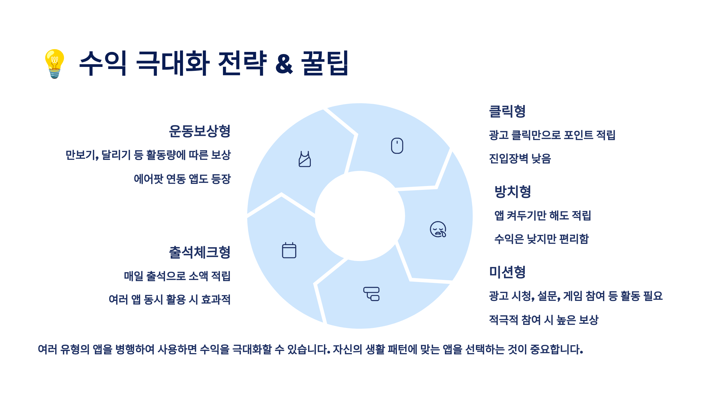 | 걷기/활동 | 캐시워크 | 건강과 수익 동시 | 수익 낮음 | 운동 좋아하는 분 |