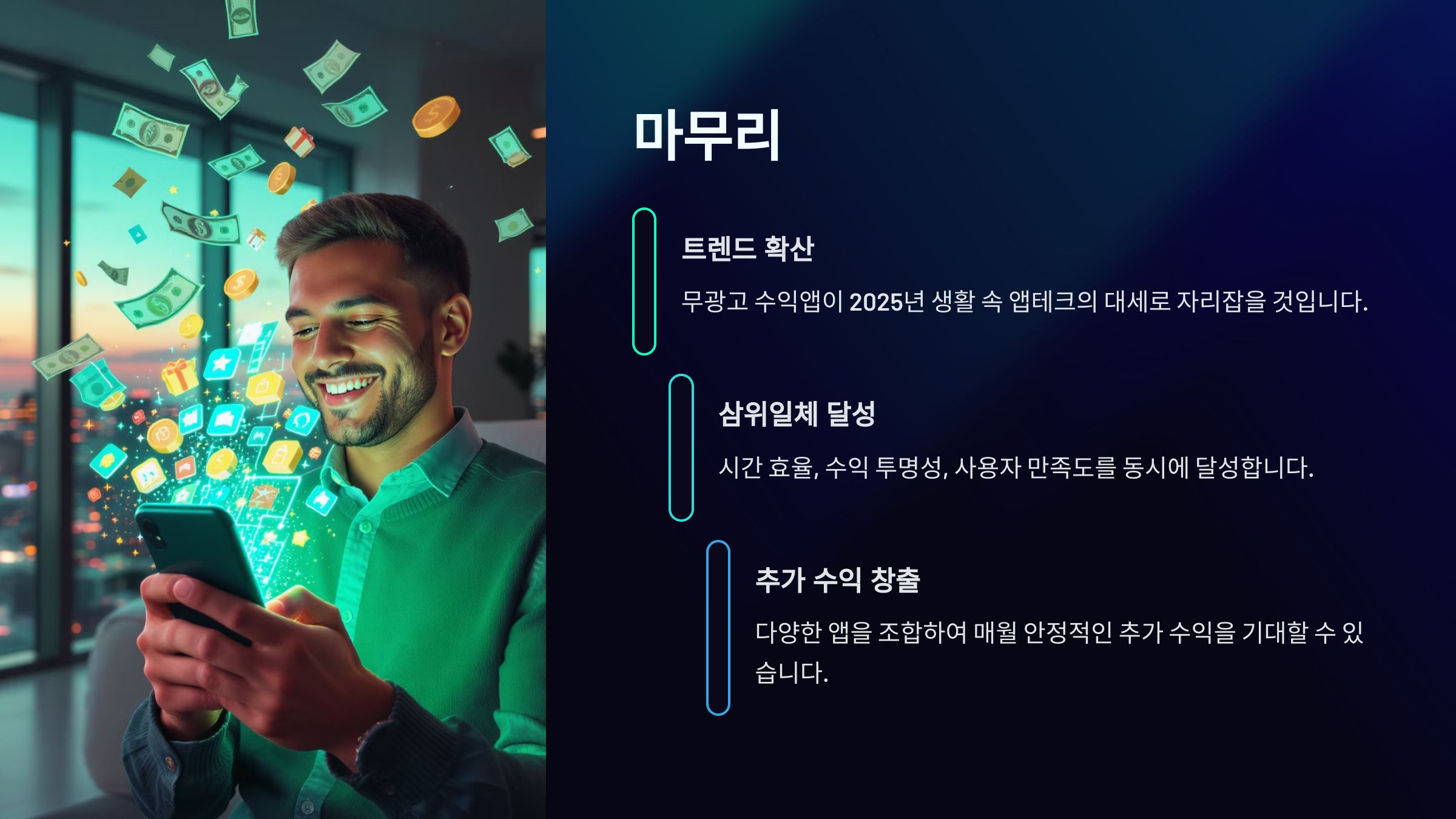 2025년 무광고 수익앱 시장은 사용자 중심의 건전한 생태계로 발전하고 있어요. 광고에 시달리지 않고도 다양한 활동으로 부수입을 창출할 수 있게 된 것은 정말 반가운 변화죠. 설문조사, 걷기, 사진 판매, 게임, 캐시백 등 자신의 라이프스타일에 맞는 앱을 선택해 꾸준히 활용한다면 월 수십만원의 추가 수익도 충분히 가능해요.