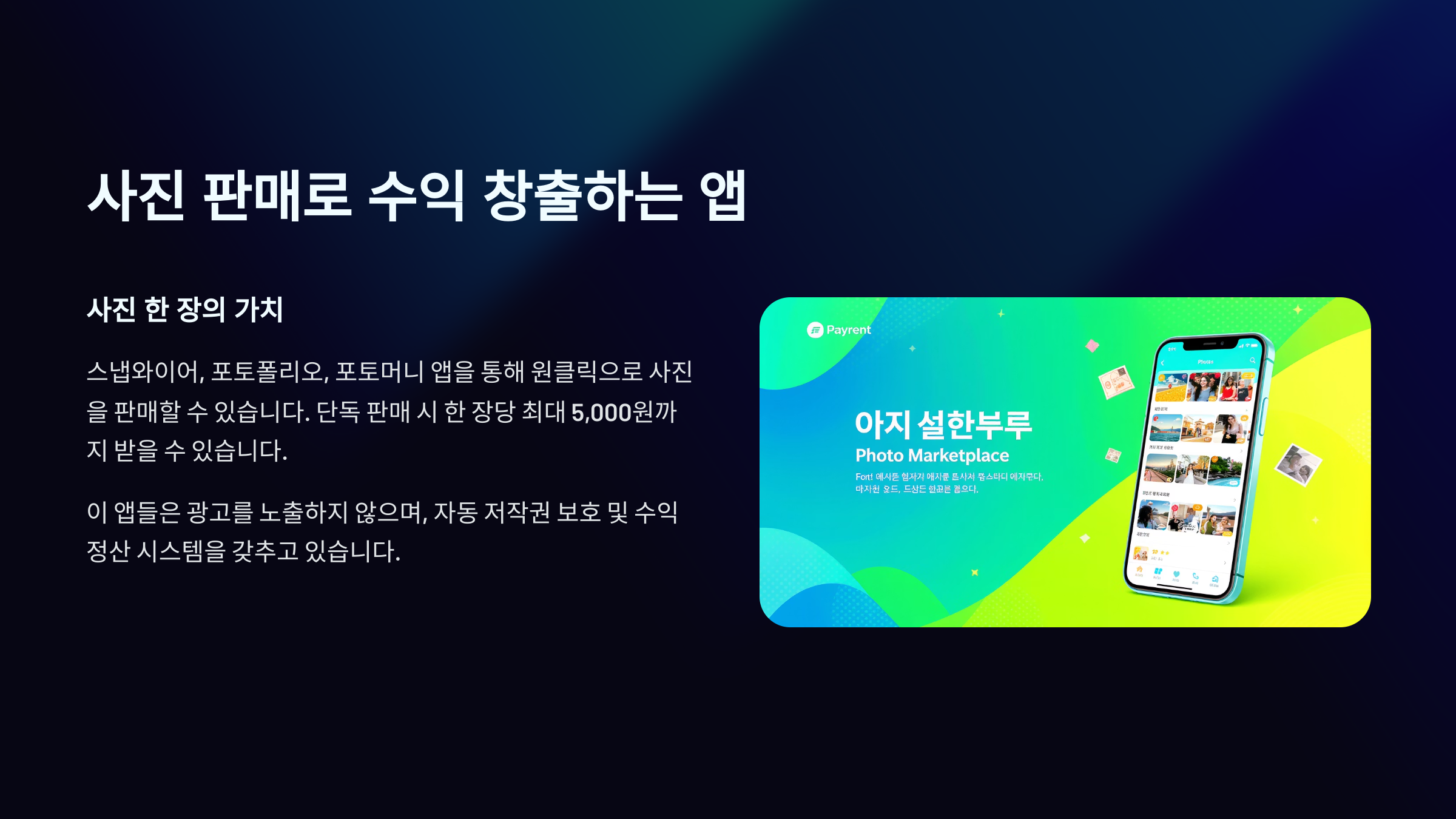'포토마켓 프로'는 국내 최대 사진 판매 플랫폼이에요. 일상 사진부터 전문적인 작품까지 다양한 사진을 판매할 수 있죠. AI가 사진의 상업적 가치를 평가해주고, 적정 가격을 제안해줘요. 특히 한국적인 콘텐츠에 대한 해외 수요가 높아 K-컬처 관련 사진들이 인기를 끌고 있답니다.