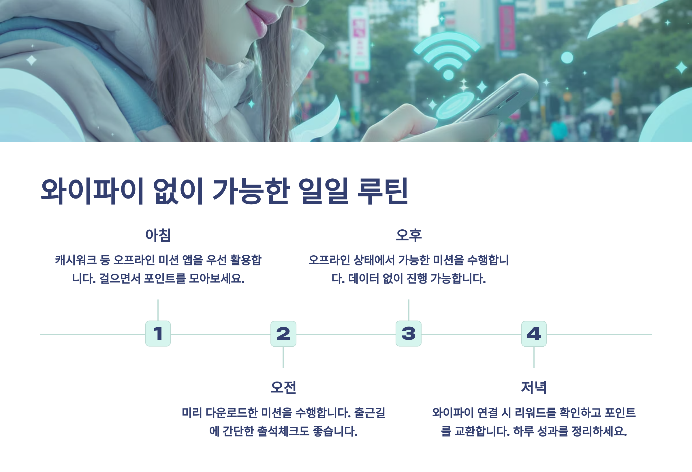 와이파이 없이도 효율적으로 앱테크를 하려면 체계적인 루틴이 필요해요. 제가 직접 실천하고 있는 일일 루틴을 공유해드릴게요. 이 루틴을 따르면 하루 데이터 사용량 50MB 이하로도 1500-2000원의 수익을 올릴 수 있답니다. 시간대별로 나눠서 설명드릴게요! ⏰