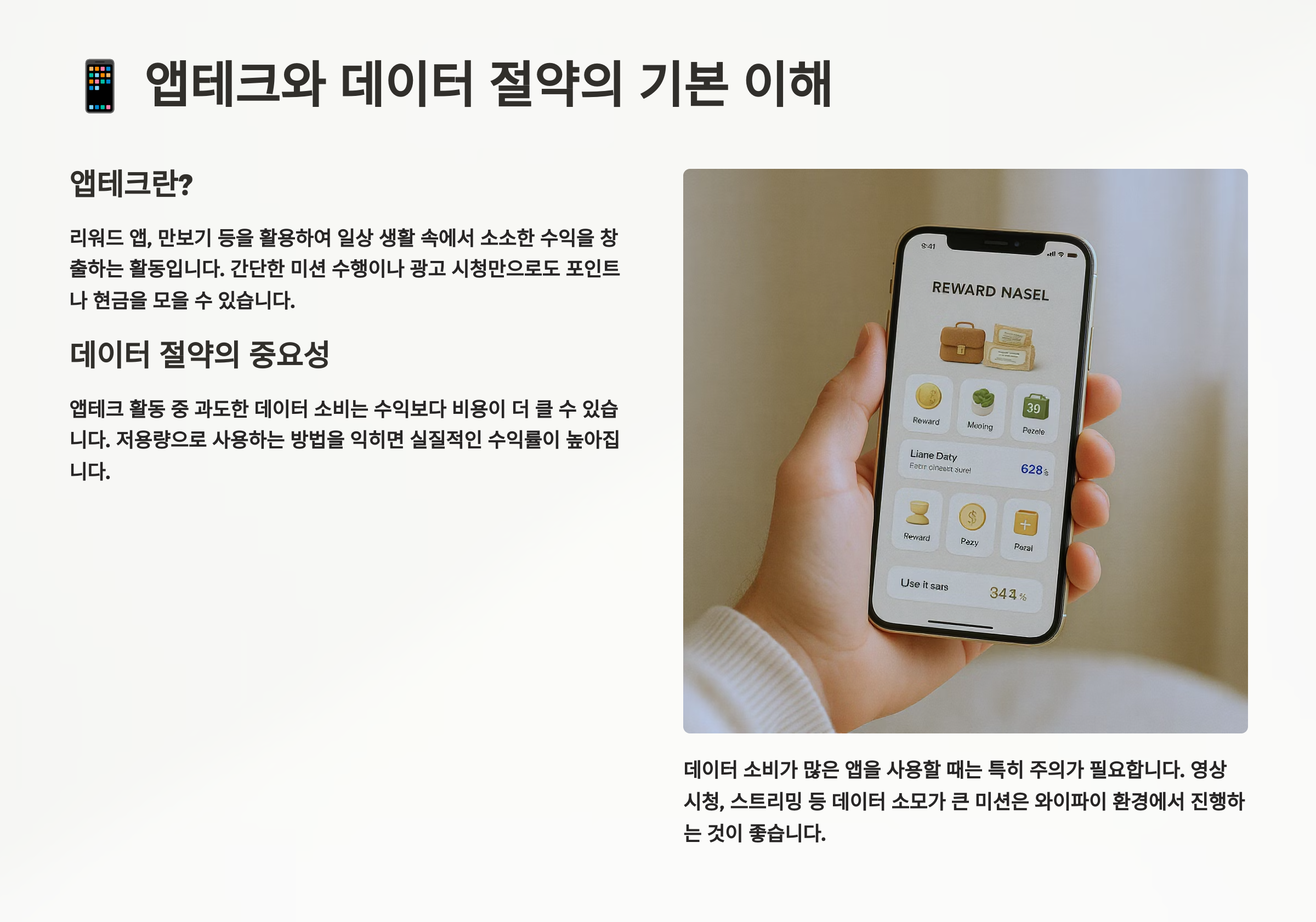 최근 통신비 부담이 늘어나면서 많은 분들이 데이터 절약에 관심을 가지고 있어요. 특히 앱테크를 하시는 분들은 하루에도 여러 앱을 사용하다 보니 데이터 소진이 빠를 수밖에 없죠. 하지만 똑똑한 방법을 활용하면 최소한의 데이터로도 충분히 수익을 낼 수 있답니다. 지금부터 데이터 절약형 앱테크의 모든 것을 자세히 알아볼게요! 💰