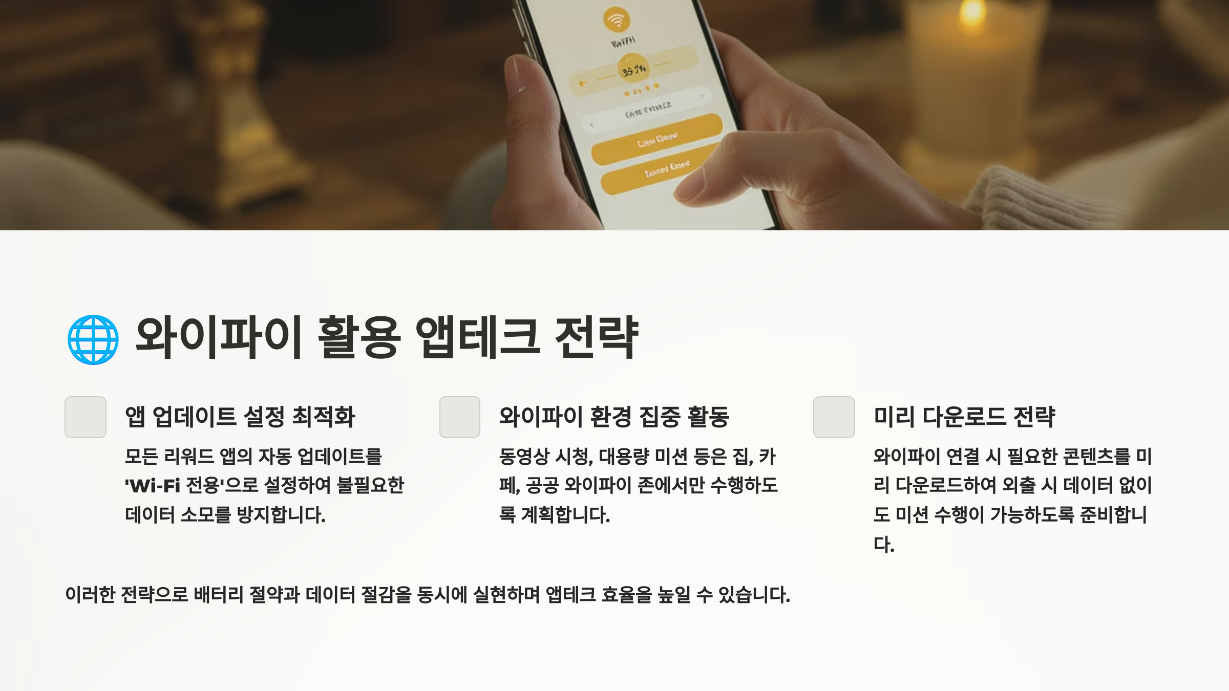집에서 와이파이를 사용할 때는 '와이파이 스케줄러' 기능을 활용해보세요. 특정 시간대에만 와이파이를 켜도록 설정하면 배터리도 아끼고 불필요한 백그라운드 데이터 사용도 막을 수 있어요. 저는 주로 저녁 7시부터 10시까지 집중적으로 앱테크를 하는데, 이 시간에만 와이파이를 켜두고 있어요! 📡