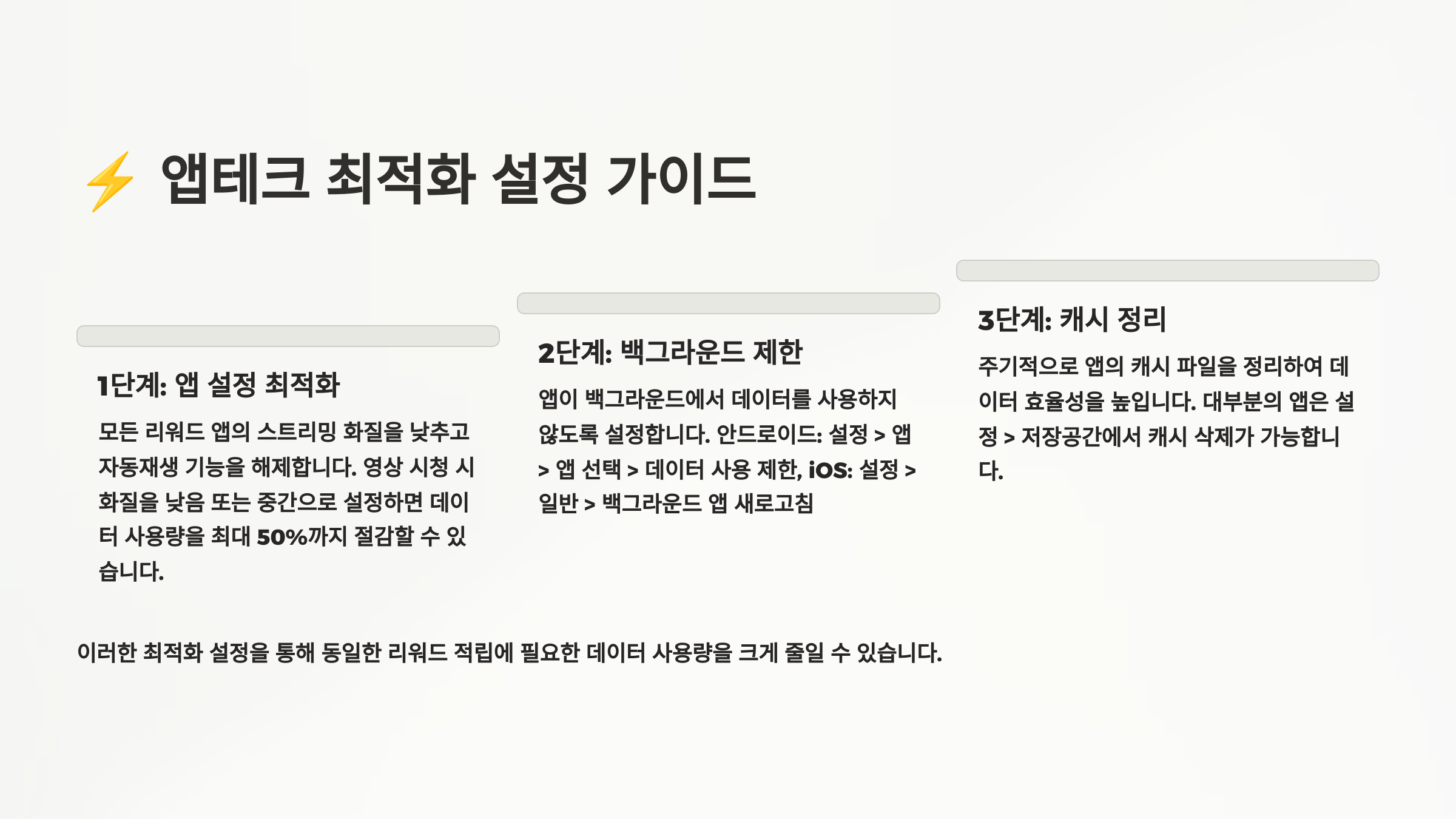 데이터를 아끼면서도 확실한 수익을 낼 수 있는 저용량 리워드앱들을 소개해드릴게요. 이 앱들은 모두 하루 10MB 이하의 데이터만 사용하면서도 꾸준한 수익을 보장해요. 실제로 제가 3개월 이상 사용해보고 검증한 앱들이니 믿고 사용하셔도 좋아요!
