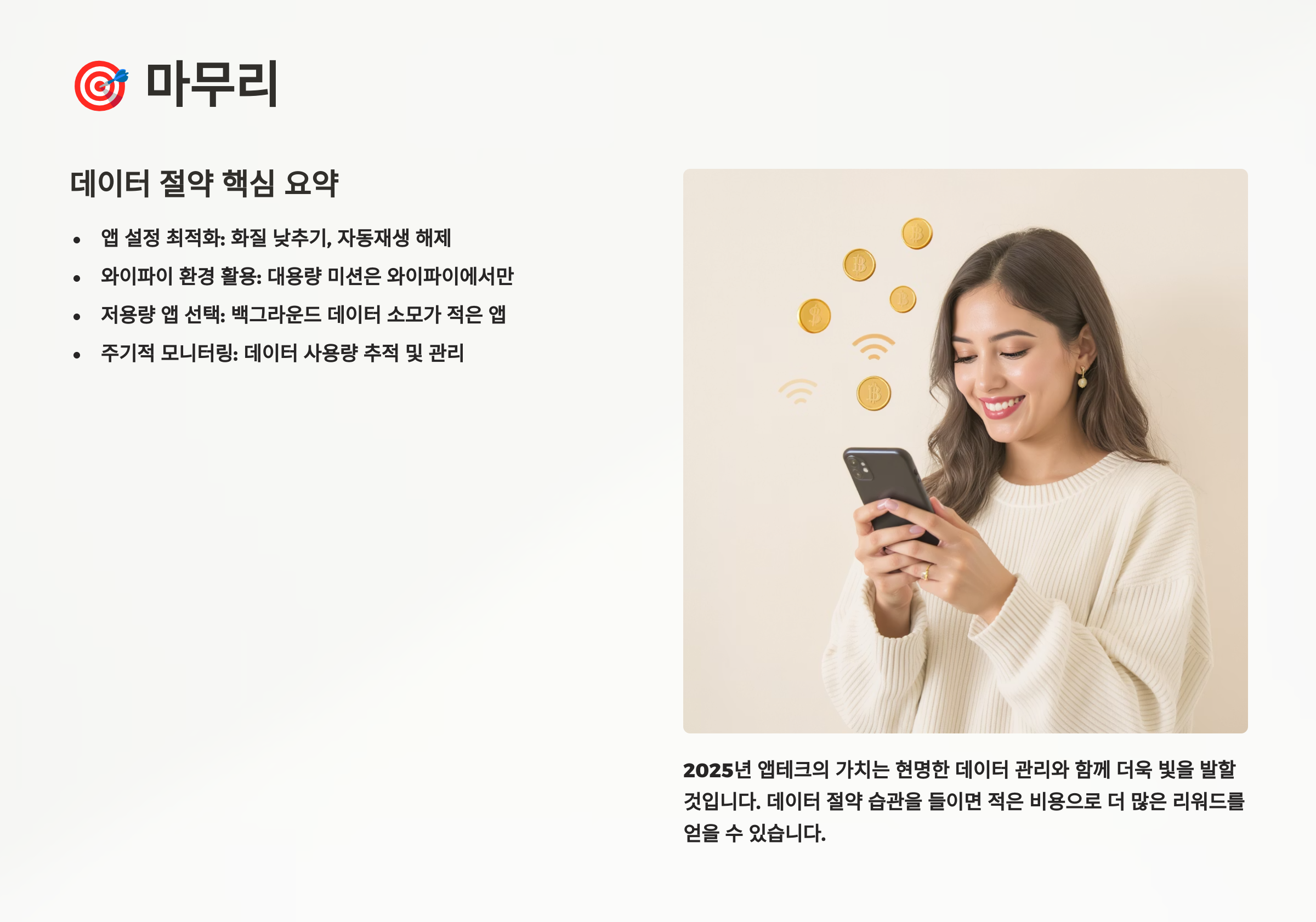 데이터 절약형 앱테크의 세계에 오신 것을 환영합니다. 스마트한 선택과 꾸준한 노력으로 여러분의 통장이 조금씩 두둑해지기를 응원할게요. 앱테크는 마라톤과 같아요. 천천히, 하지만 꾸준히 나아가다 보면 반드시 목표 지점에 도달할 수 있답니다. 행운을 빕니다! 🍀