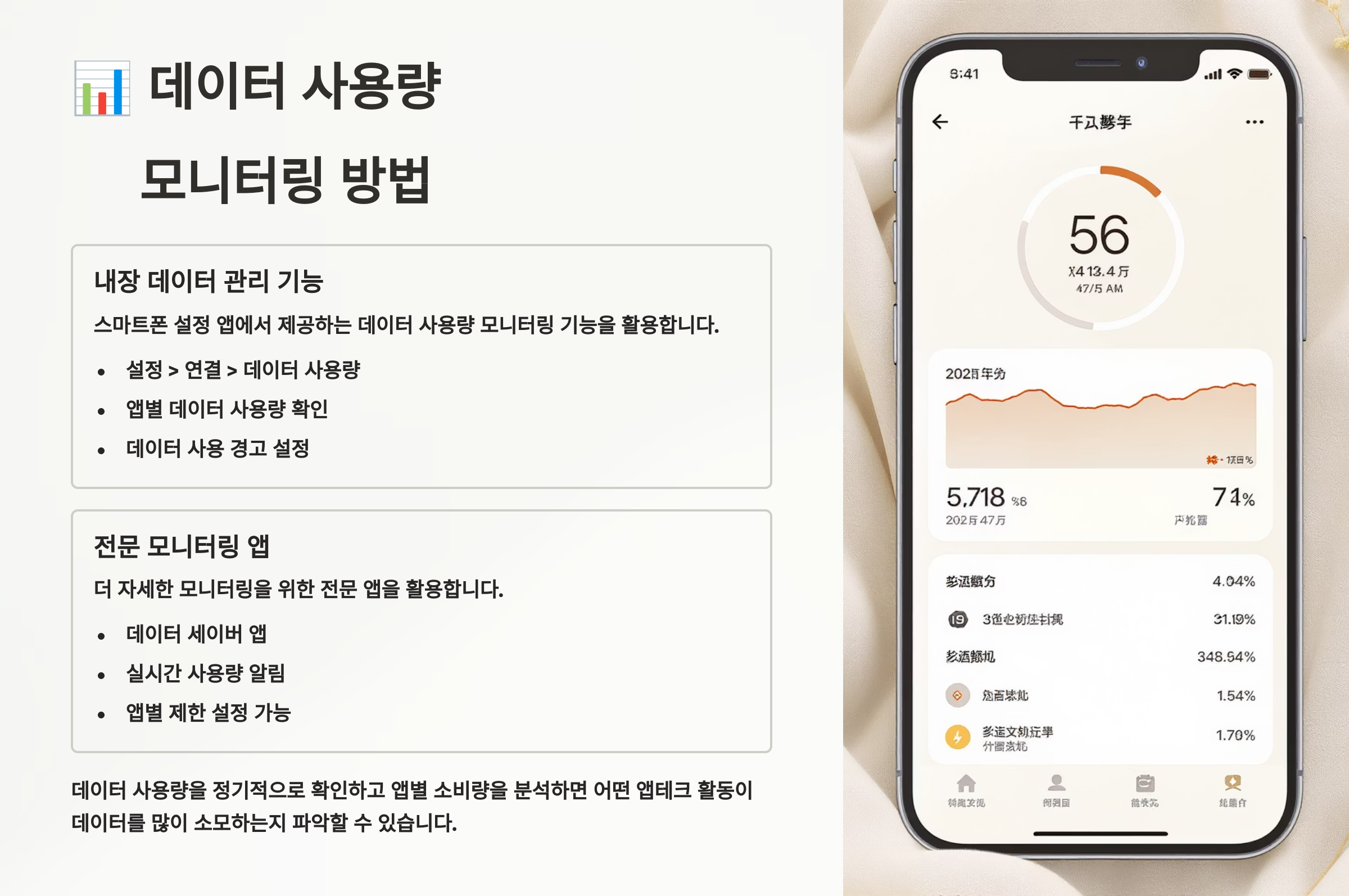 효율적인 앱테크를 위해서는 데이터 사용량을 정확히 파악하고 관리하는 것이 필수예요. 스마트폰에는 기본적으로 데이터 사용량을 확인할 수 있는 기능이 있지만, 더 자세한 분석을 위해서는 전문 앱을 활용하는 것이 좋아요. 어떤 앱이 얼마나 데이터를 사용하는지 정확히 알아야 절약 계획을 세울 수 있거든요.