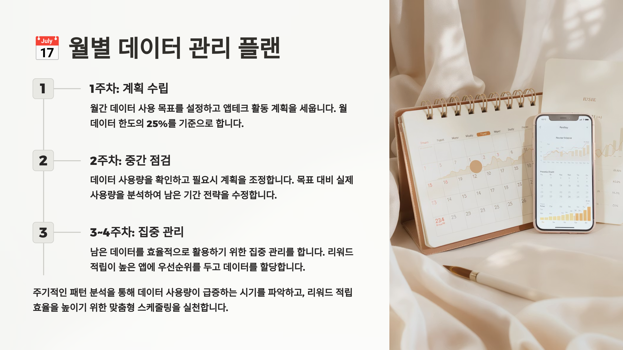 넷째 주는 데이터 절약 기간으로 정해요. 남은 데이터를 확인하고 부족하다면 저용량 앱 위주로만 사용해요. 반대로 데이터가 많이 남았다면 평소에 하지 못했던 동영상 시청형 앱테크에 도전해보기도 해요. 어차피 남은 데이터는 다음 달로 이월되지 않으니까 적절히 활용하는 게 중요하답니다! 📅