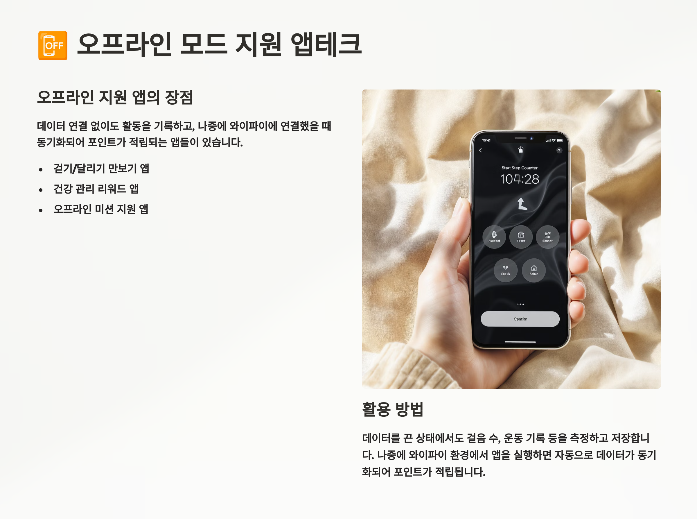 나의 생각으로는 오프라인 모드의 가장 큰 장점은 배터리 절약이에요. 데이터 통신을 하지 않으니 배터리 소모가 현저히 줄어들거든요. 특히 하루 종일 밖에서 활동하는 분들에게는 오프라인 앱테크가 최고의 선택이 될 수 있어요. 충전 걱정 없이 꾸준히 포인트를 모을 수 있답니다! 📴