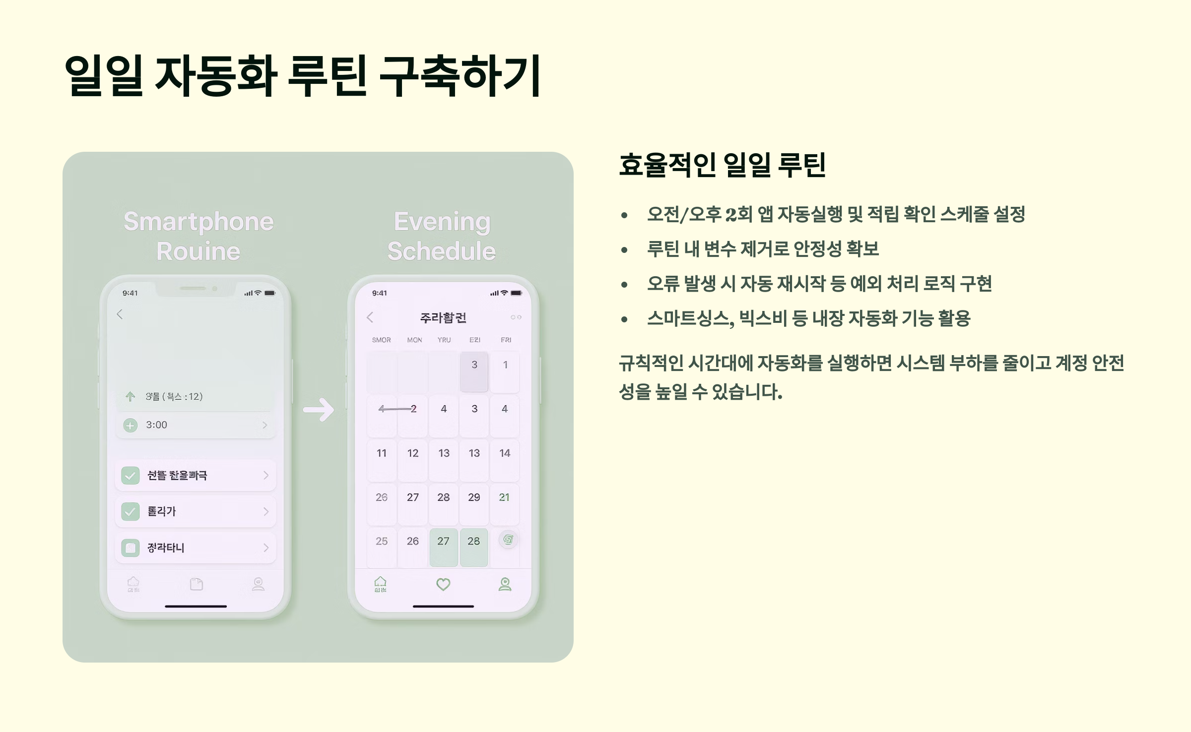 | 06:00~09:00 | 출석체크, 일일미션 | 500~1,000원 | 예약 실행 설정 |