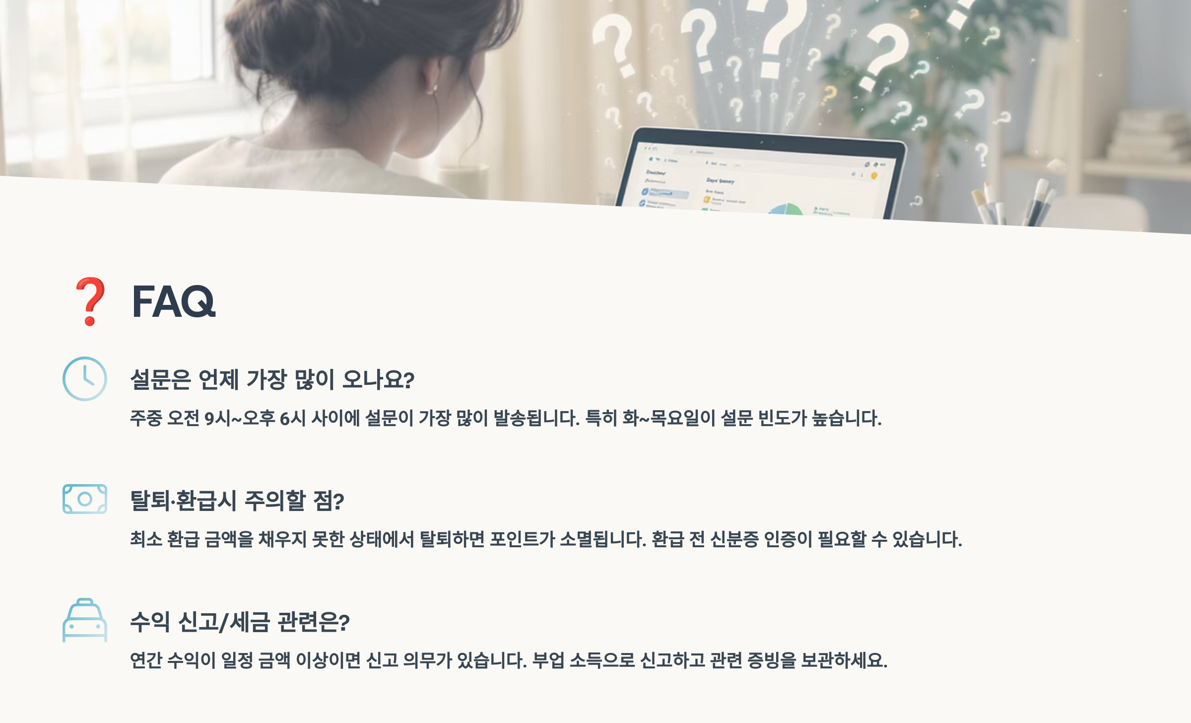A8. 각 앱의 고객센터나 문의 메뉴를 통해 연락하면 돼요. 설문 완료 후 보상이 지급되지 않거나, 포인트 관련 문제가 있을 때는 스크린샷 등의 증거를 미리 준비해두면 해결이 빨라져요. 대부분의 문제는 1-3일 내에 해결됩니다.