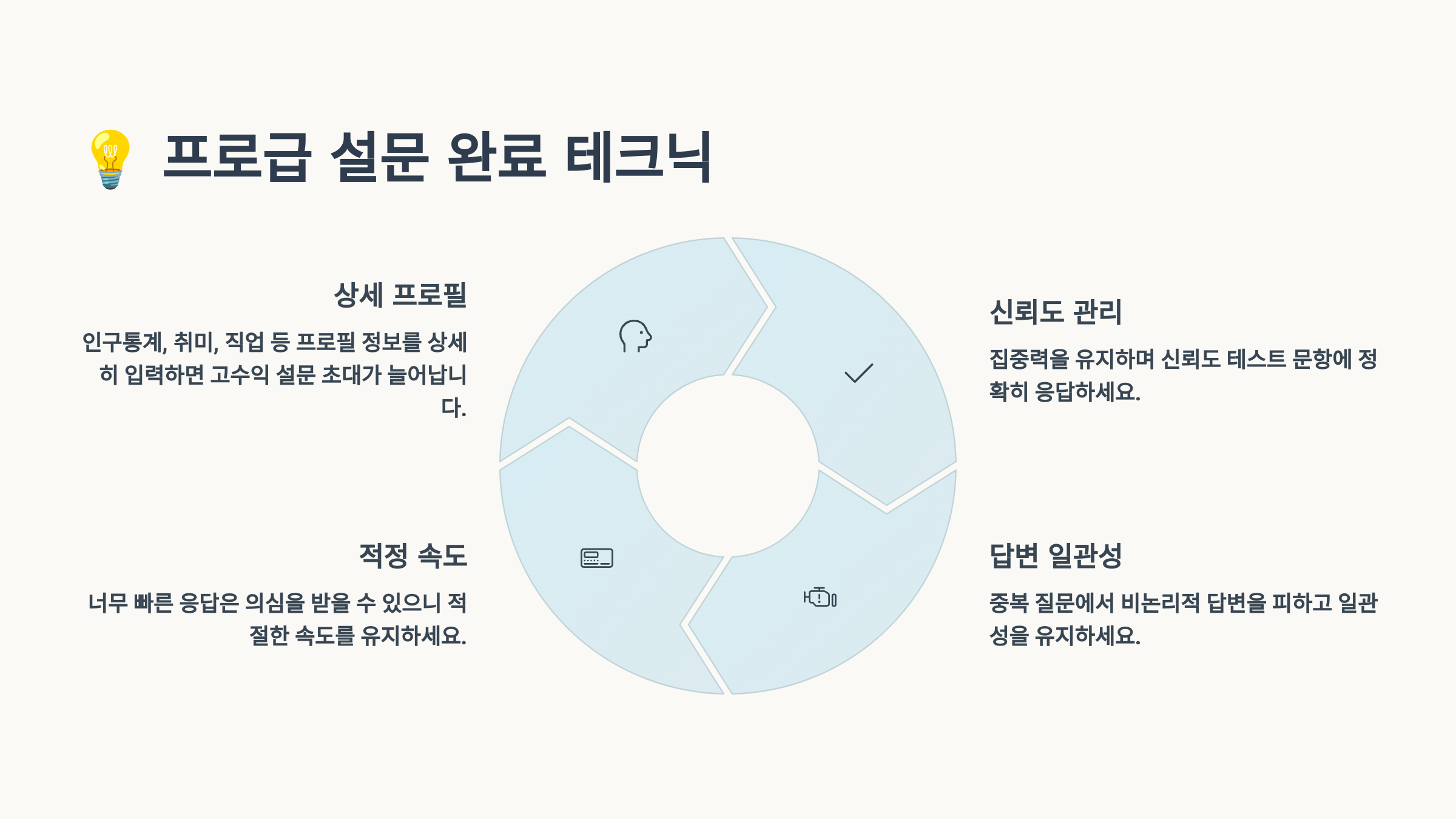 A4. 주요 원인은 타겟 대상이 아니거나, 답변 일관성이 떨어지거나, 어텐션 체크 질문을 놓치는 경우예요. 프로필을 정확히 작성하고, 일관된 답변을 유지하며, 질문을 주의깊게 읽으면 탈락률을 크게 줄일 수 있어요.