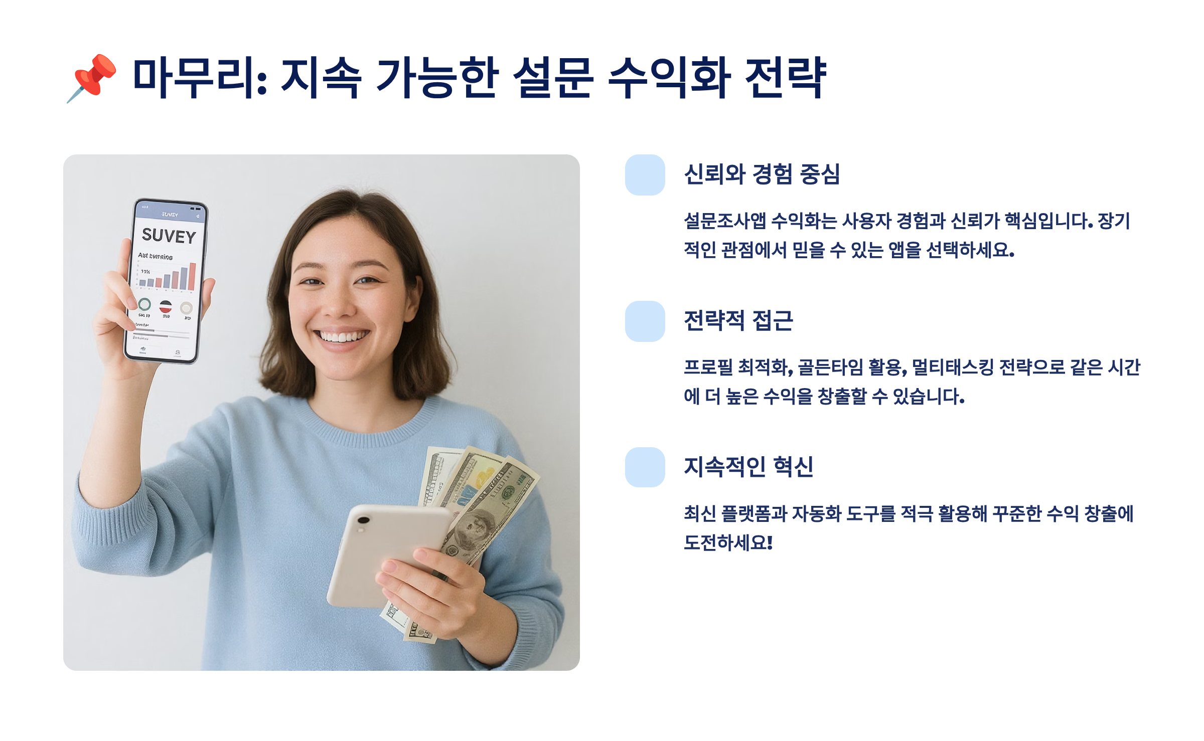 설문조사앱은 특별한 기술이나 자본 없이도 누구나 시작할 수 있는 부업이에요. 스마트폰과 약간의 시간만 있으면 돼요. 하지만 효율적인 전략 없이는 시간만 낭비하기 쉬워요. 이 글에서 소개한 앱 선별 전략, 골든타임 활용법, 프로필 최적화, 멀티태스킹 기법 등을 잘 활용하면 남들보다 2~3배 더 많은 수익을 올릴 수 있어요.