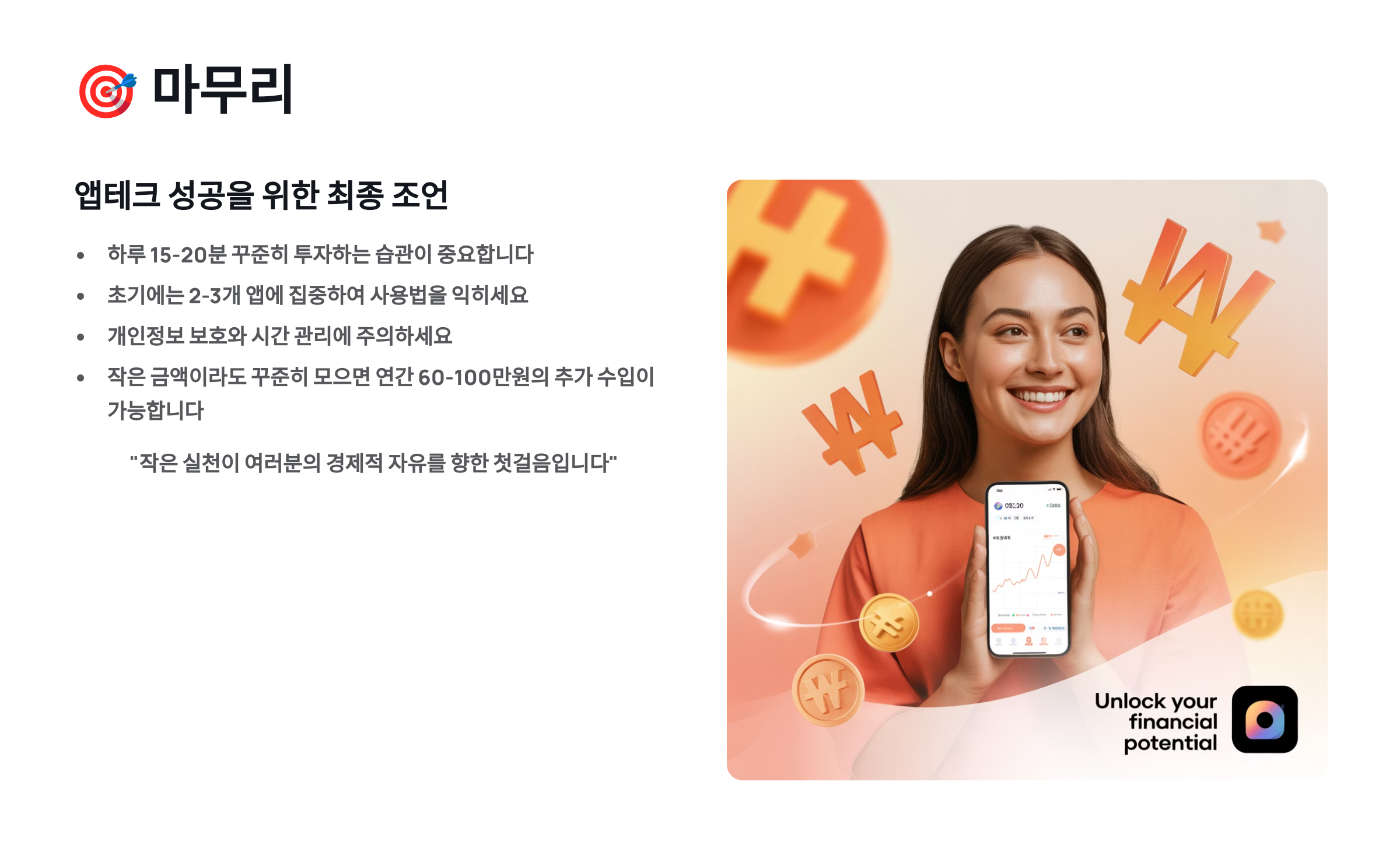 나의 경험상 앱테크로 월 30만원 정도는 충분히 벌 수 있었어요. 처음에는 하루에 천원도 안 되는 수익이라 실망했지만, 꾸준히 하다 보니 어느새 제법 쏠쏠한 부수입이 되더라구요. 특히 출퇴근 시간을 활용해서 하니까 시간도 효율적으로 쓸 수 있었답니다! 😊