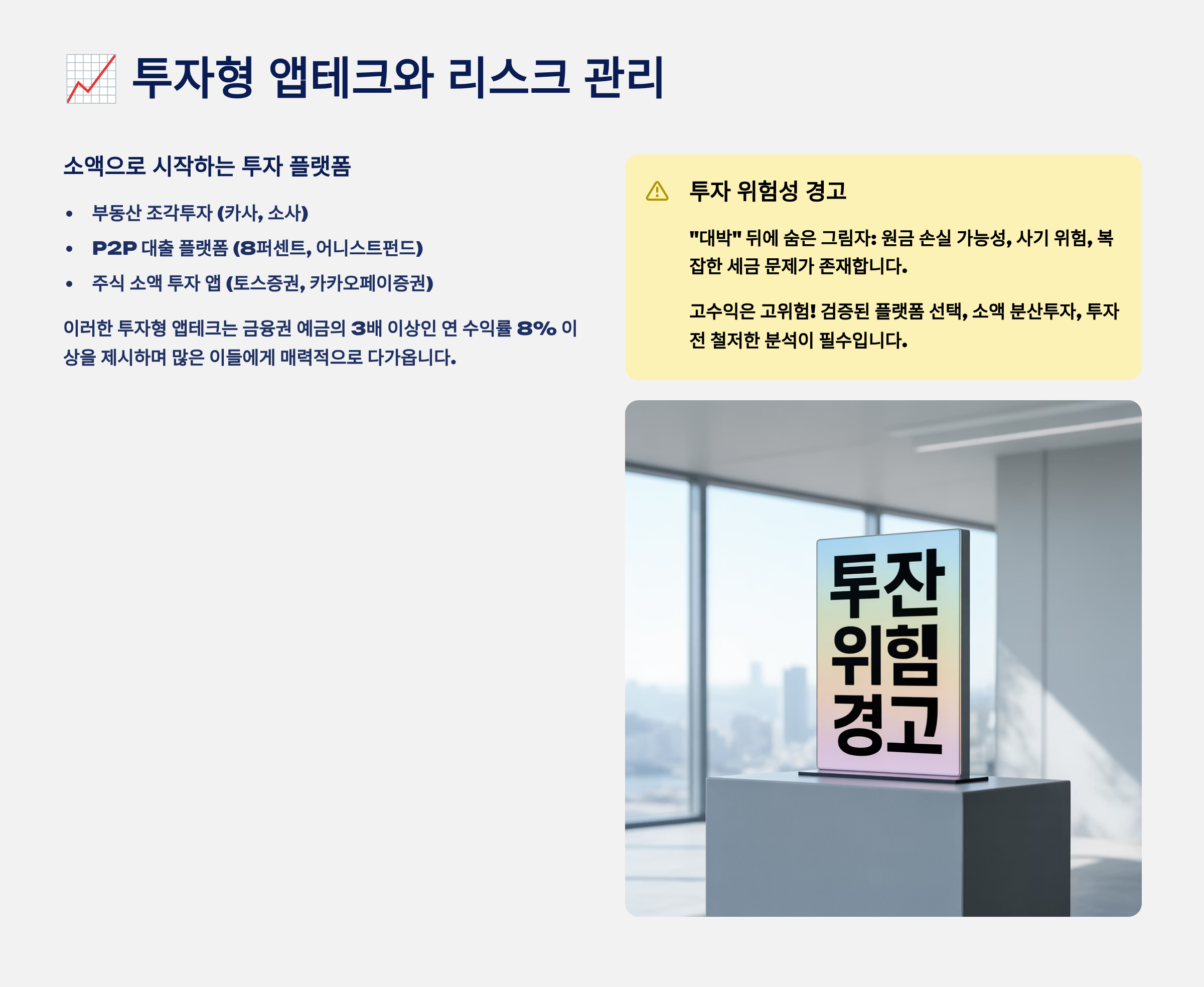 | P2P 투자 | 연 8-15% | 높음 | 1만원 |