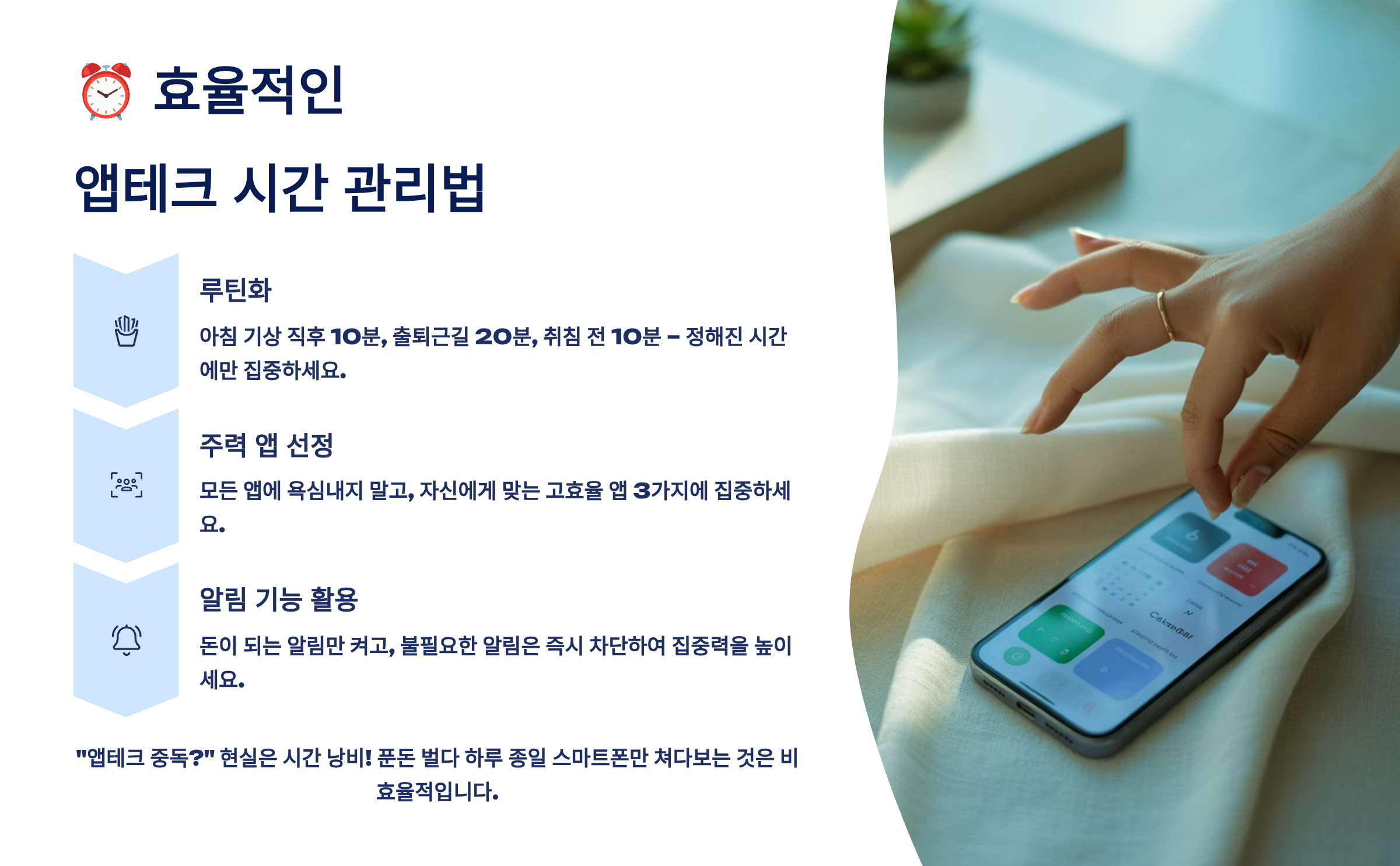 앱테크로 성공하려면 시간 관리가 정말 중요해요. 많은 사람들이 앱테크에 너무 많은 시간을 투자해서 오히려 시급으로 따지면 손해를 보는 경우가 있어요. 효율적인 시간 관리를 통해 최소한의 시간으로 최대한의 수익을 내는 방법을 알려드릴게요. 2025년 현재 성공적인 앱테커들의 평균 활동 시간은 하루 1-2시간이에요.