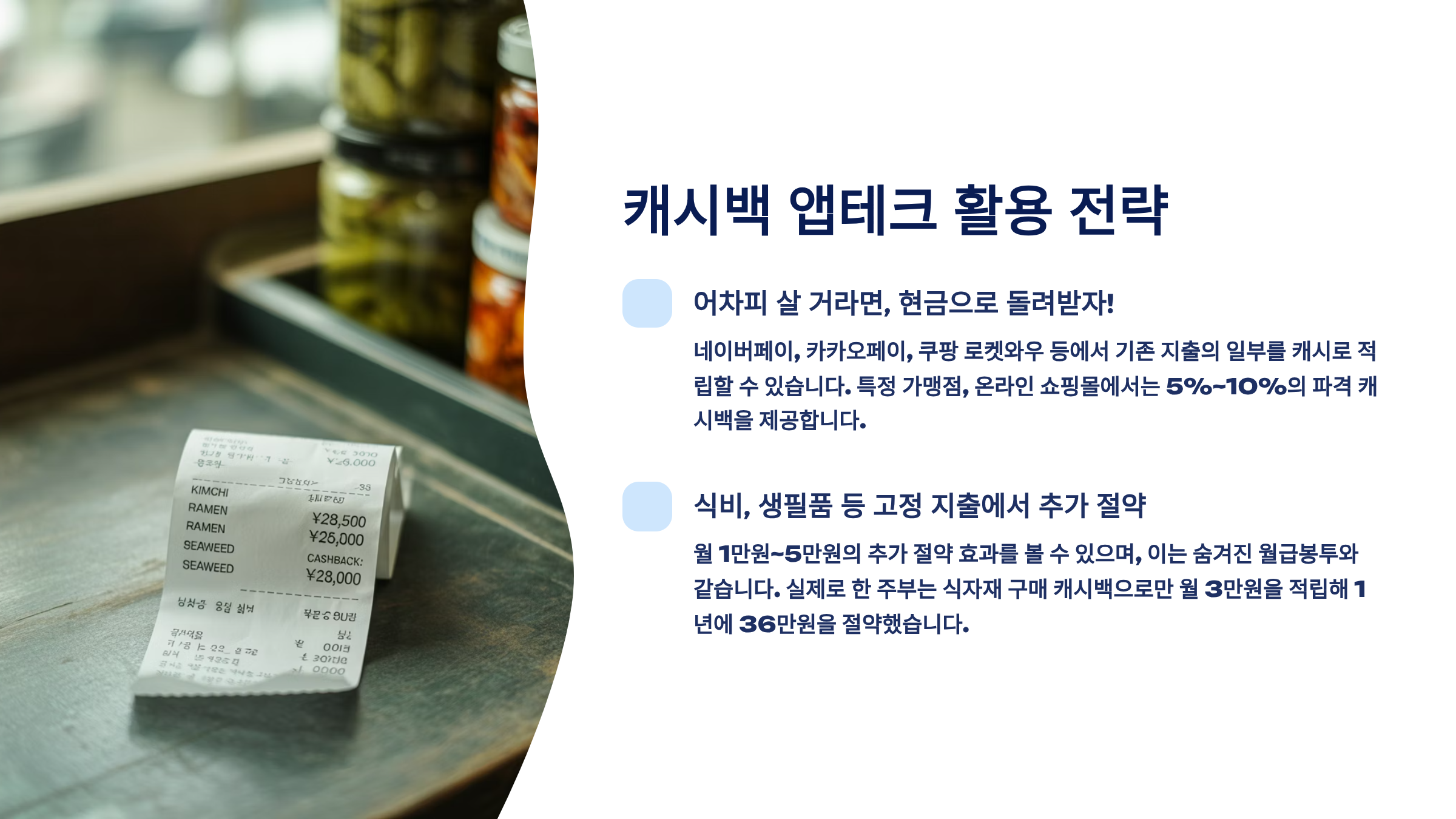 캐시백 앱테크의 가장 큰 장점은 추가적인 노력 없이도 수익을 낼 수 있다는 점이에요. 평소에 하던 쇼핑을 캐시백 앱을 통해서 하기만 하면 돼요. 특히 정기적으로 구매하는 생필품, 식료품 등에서 꾸준히 캐시백을 받으면 연간 수십만 원을 절약할 수 있어요. 이렇게 아낀 돈으로 또 다른 투자를 할 수 있으니 일석이조죠! 🛍️