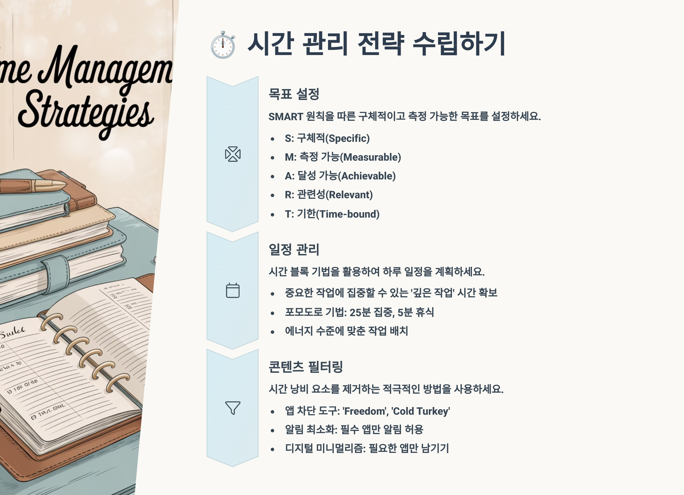 | 시간 블록킹 | 일정을 시간별로 구획화 | 체계적인 하루 관리 |