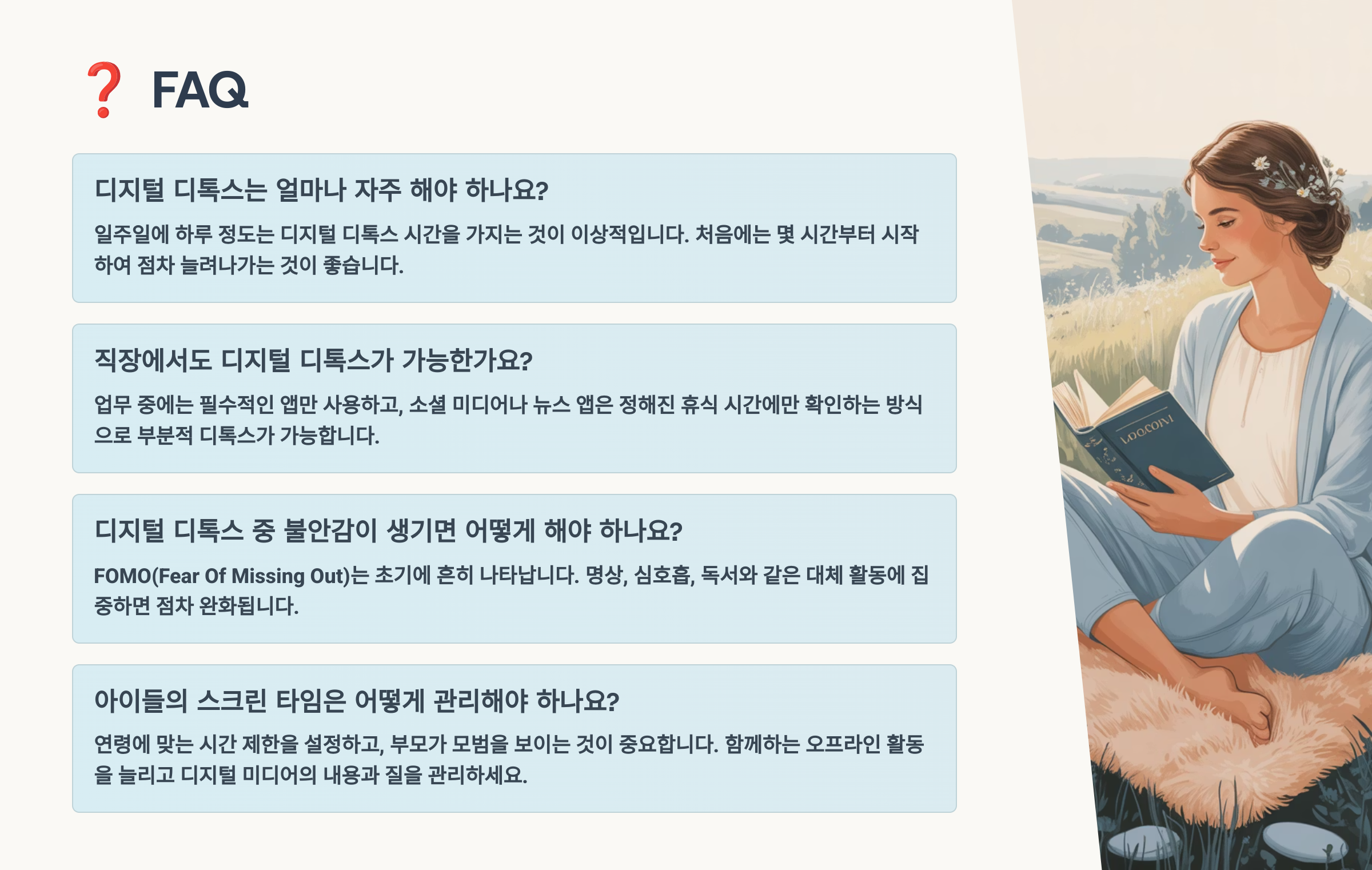A11. JOMO(Joy of Missing Out) 마인드셋을 기르세요. 모든 것을 알 필요는 없고, 정말 중요한 것은 직접 연락이 온다는 것을 기억하세요. 오프라인 경험의 가치를 재발견하는 것이 도움이 돼요.