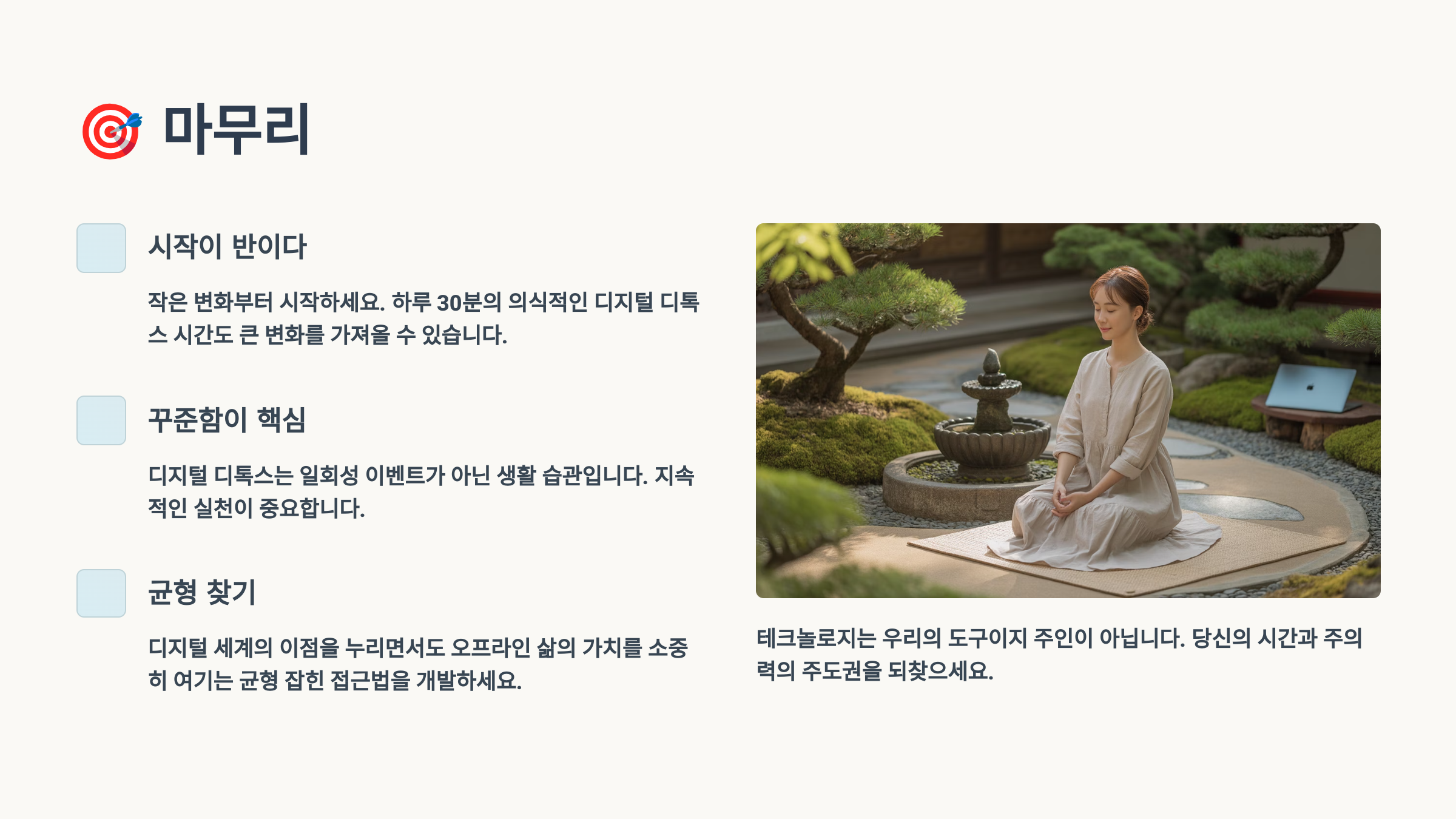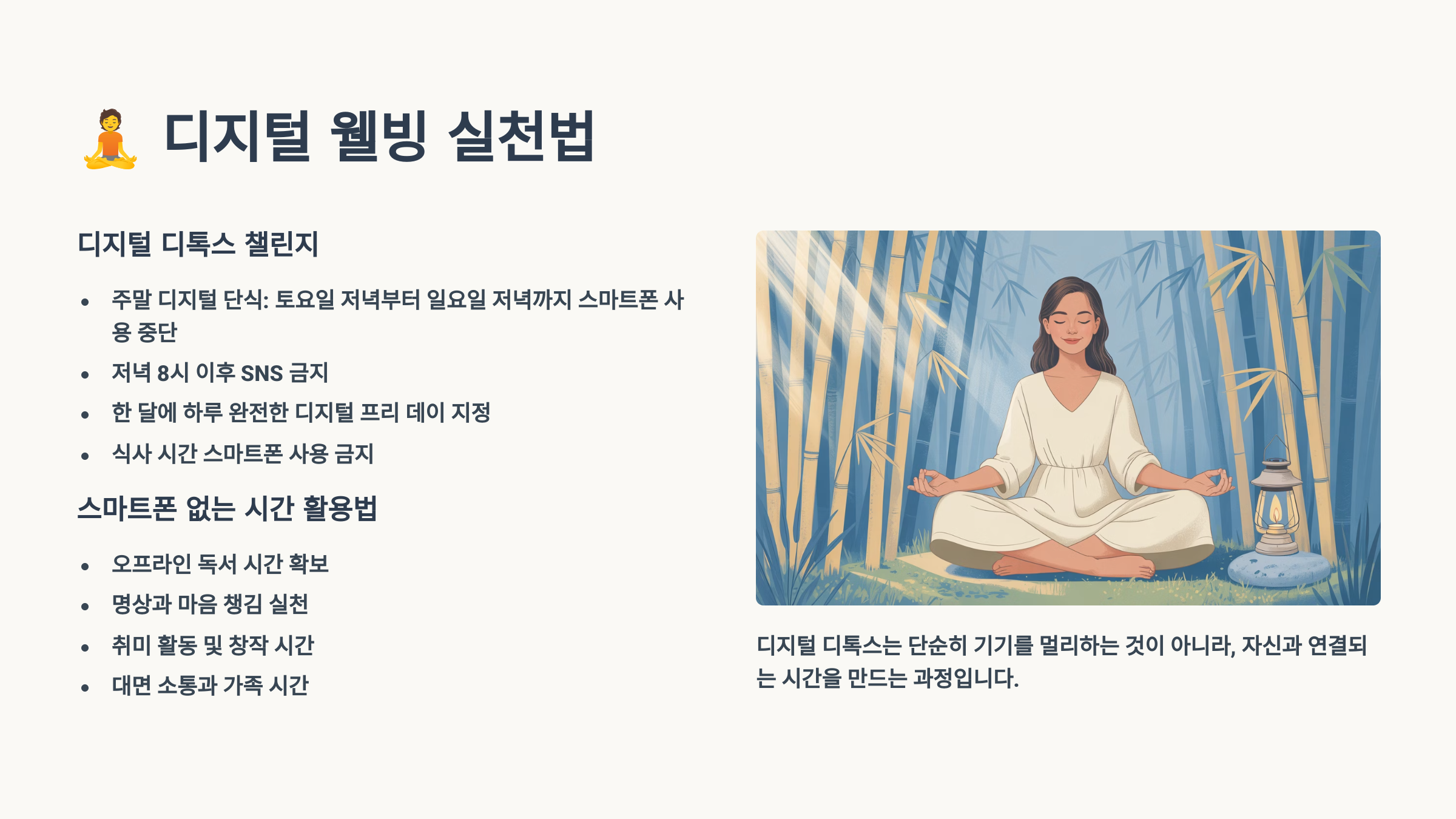 디지털 디톡스의 효과는 즉각적으로 나타나요. 스마트폰 사용을 줄인 지 일주일만 지나도 수면의 질이 개선되고, 집중력이 향상되며, 스트레스 수준이 감소한다는 연구 결과가 있어요. 또한 여유 시간이 생기면서 운동, 독서, 취미활동 등 더 의미 있는 활동에 시간을 투자할 수 있게 된답니다.