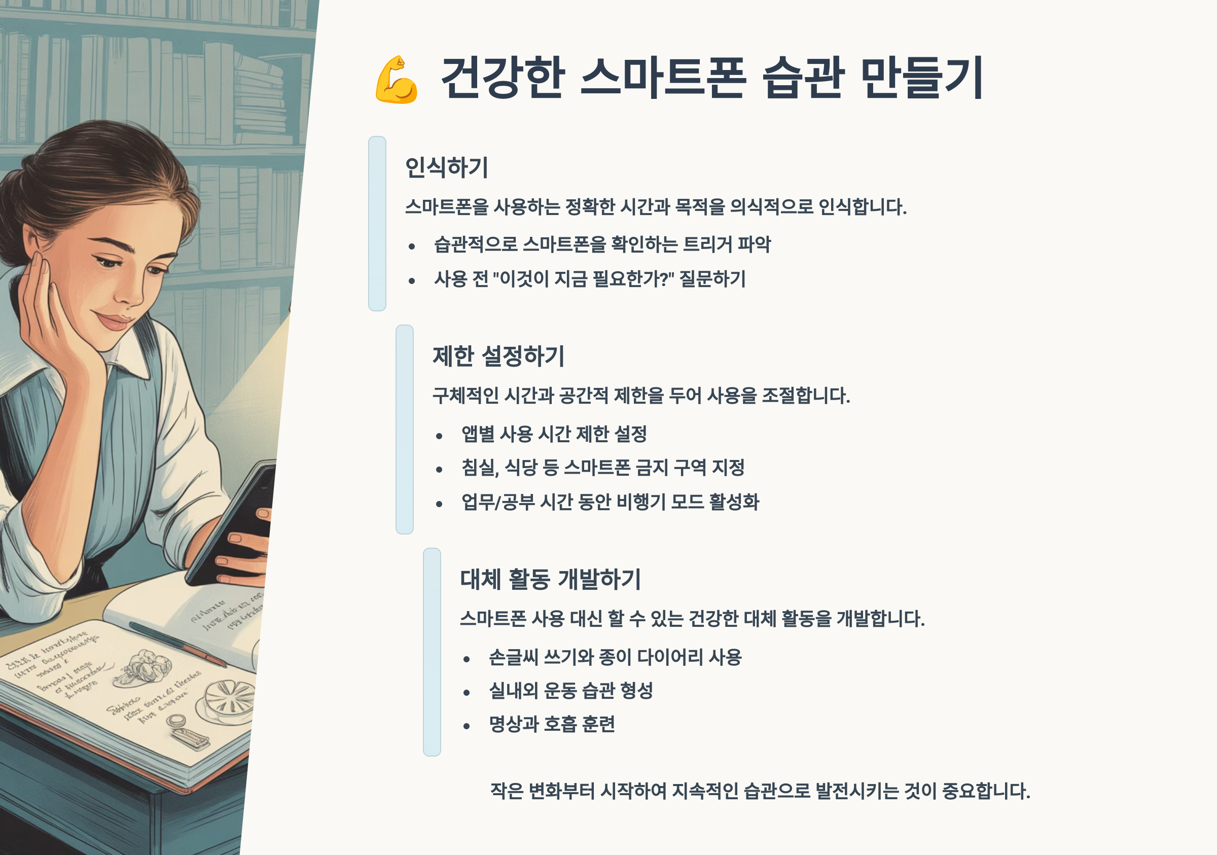 습관은 우리 행동의 40% 이상을 차지한다고 해요. 따라서 건강한 스마트폰 사용 습관을 만드는 것은 장기적인 변화를 위해 필수적이죠. 제임스 클리어의 '아주 작은 습관의 힘'에서 제시하는 습관 형성의 4가지 법칙을 스마트폰 사용에 적용해볼 수 있어요. 신호를 분명하게 만들고, 매력적으로 만들고, 쉽게 만들고, 만족스럽게 만드는 거예요.