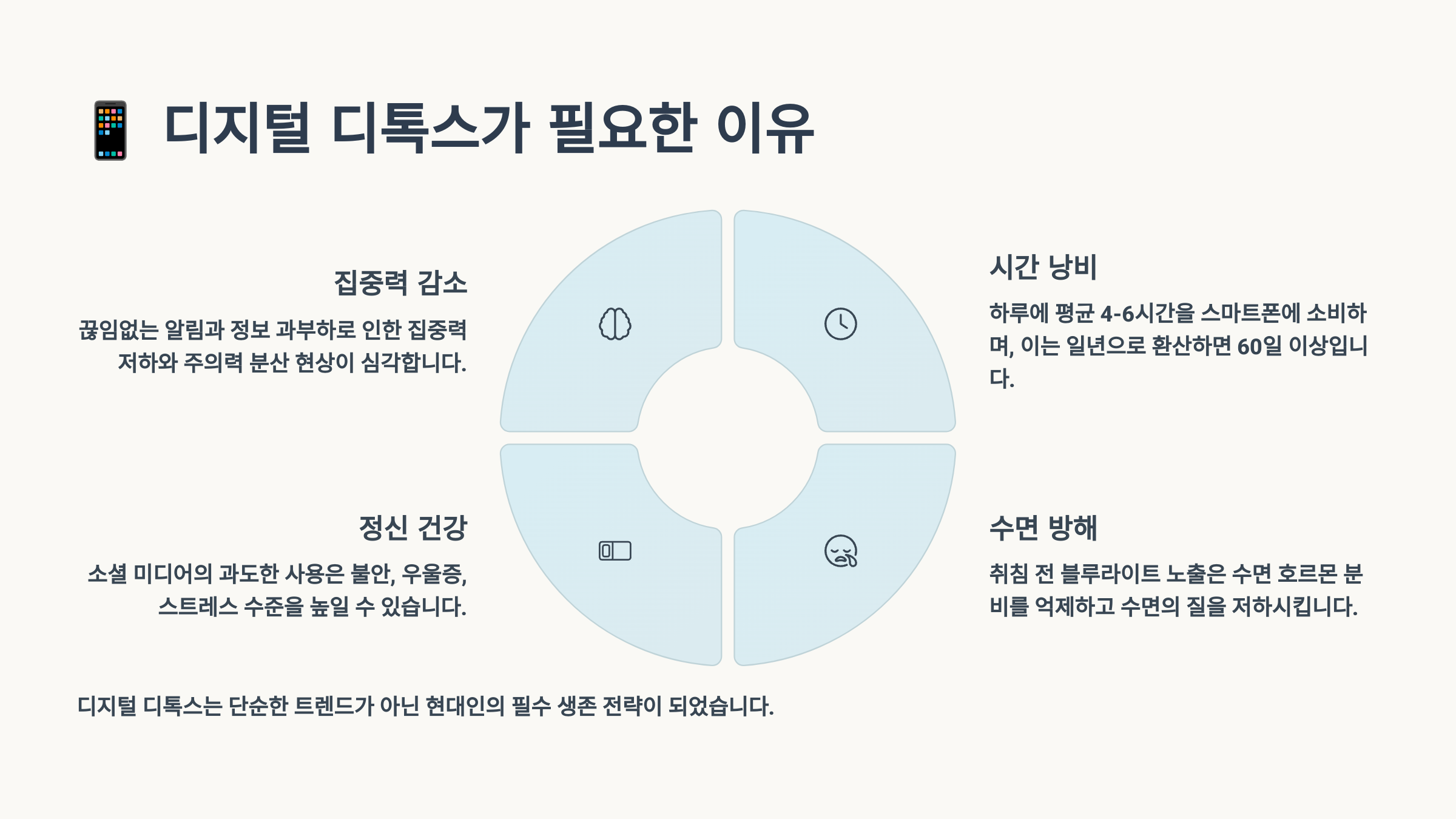 스마트폰 과다 사용은 수면 장애, 거북목 증후군, 안구건조증 같은 신체적 문제뿐만 아니라 집중력 저하, 불안감 증가, 대인관계 문제 등 정신적 문제도 야기해요. 특히 도파민 중독 현상으로 인해 즉각적인 보상에 익숙해지면서 장기적인 목표 달성이 어려워지고 있답니다. 디지털 디톡스는 이런 문제들을 해결하고 건강한 디지털 라이프를 만들기 위한 첫걸음이에요.