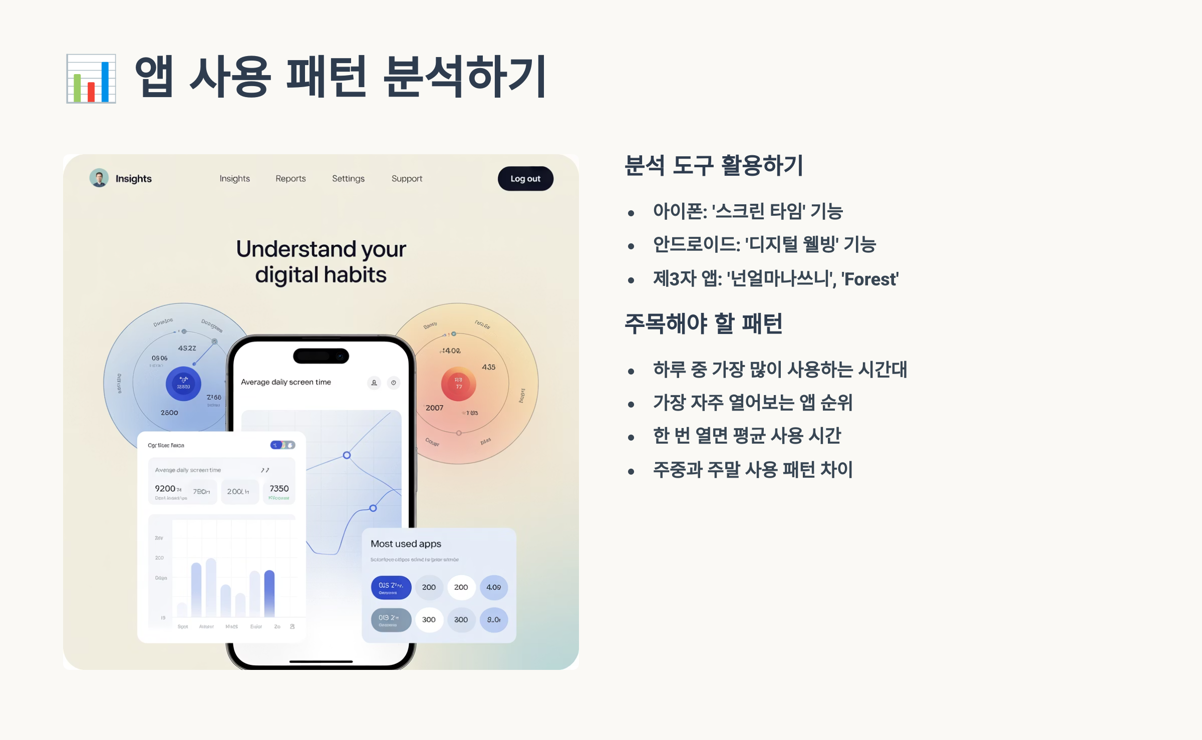 자신의 앱 사용 패턴을 정확히 파악하는 것은 디지털 디톡스의 시작점이에요. 많은 사람들이 실제 사용 시간보다 훨씬 적게 사용한다고 착각하고 있답니다. 스마트폰에 내장된 스크린타임(iOS)이나 디지털 웰빙(Android) 기능을 활용하면 객관적인 데이터를 확인할 수 있어요. 이 데이터를 통해 어떤 앱에 가장 많은 시간을 쓰는지, 하루 중 언제 가장 많이 사용하는지 파악할 수 있답니다.