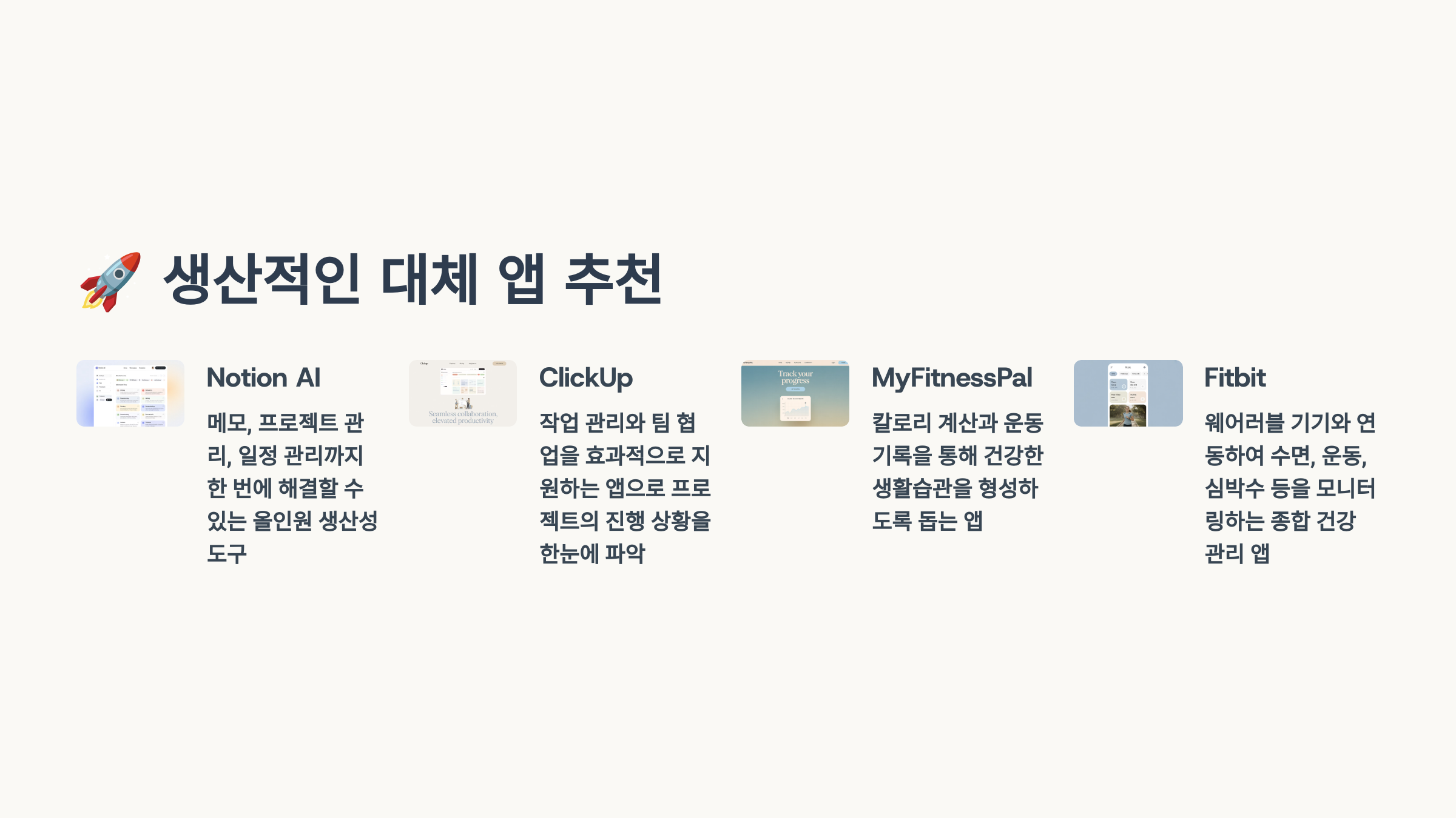 | 카테고리 | 추천 앱 | 주요 특징 |