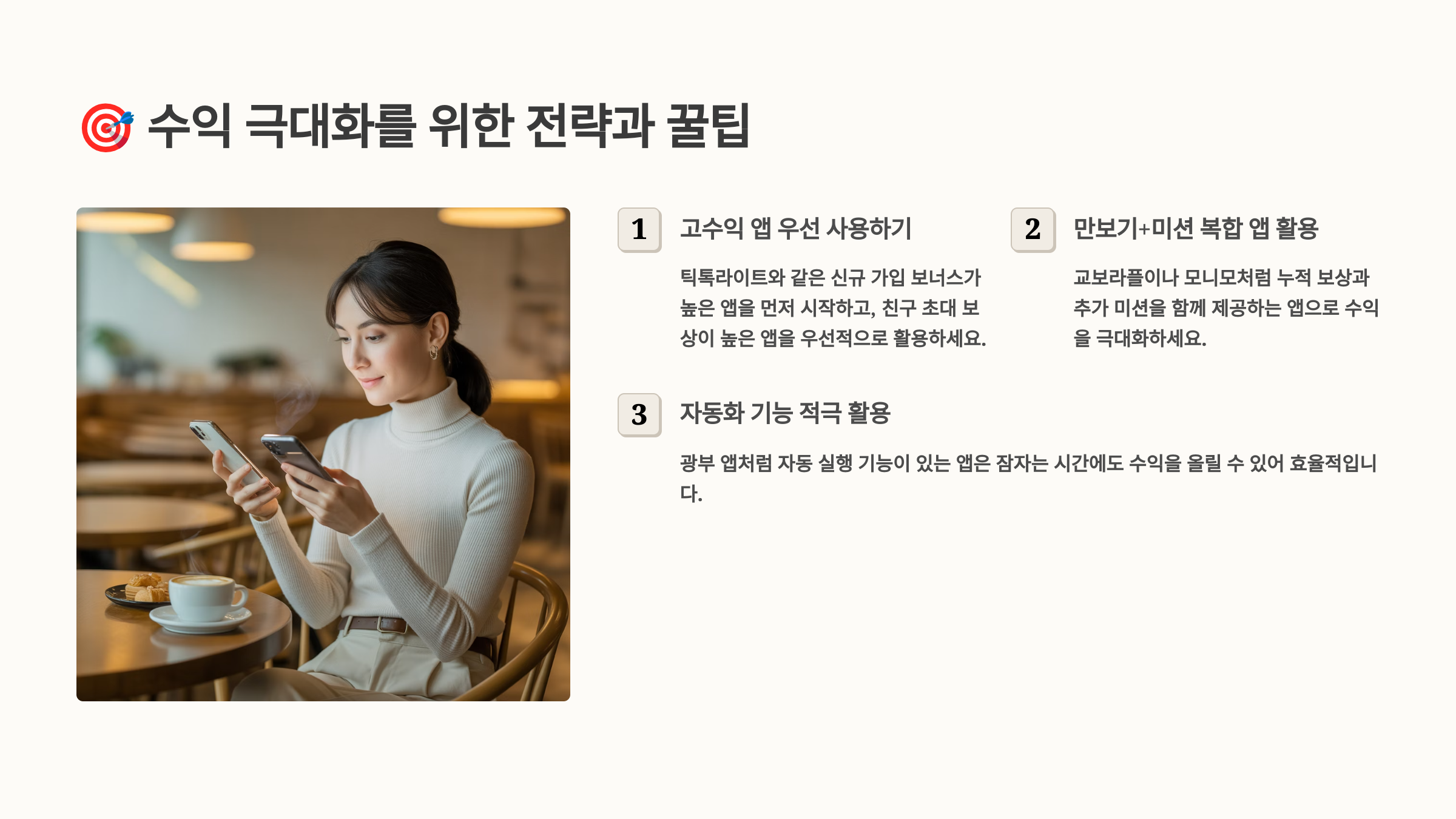 | 멀티 앱 활용 | 동일 카테고리 앱 3~4개 동시 사용 | 수익 2~3배 증가 |