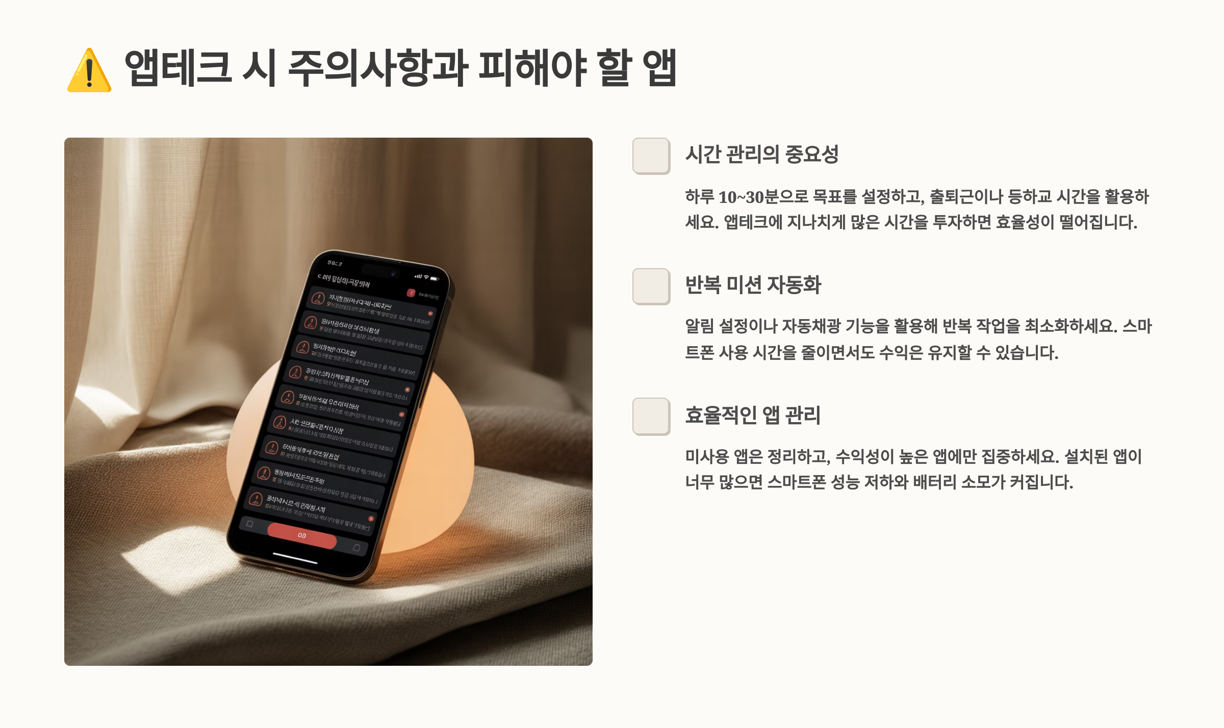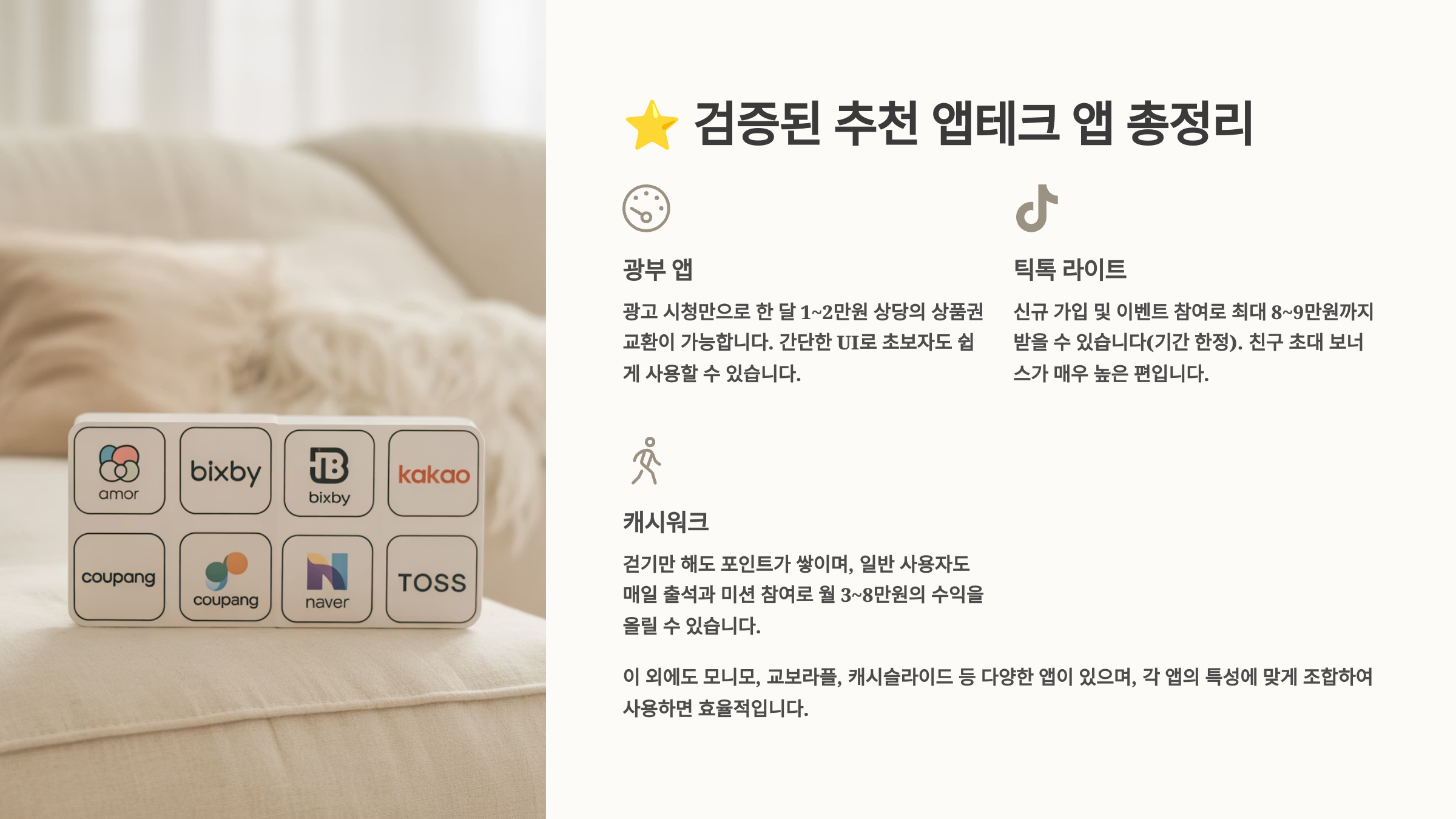 오늘은 앱테크의 A부터 Z까지, 그리고 실제 수익 인증과 함께 검증된 추천 앱들을 소개해드리려고 해요. 특히 초보자도 쉽게 시작할 수 있는 앱부터 수익성이 높은 고급 앱까지, 다양한 앱테크 방법을 총정리했답니다. 현실적인 기대 수익과 함께 효율적인 시간 관리 방법, 그리고 반드시 피해야 할 함정들까지 모두 알려드릴게요! 💰📱