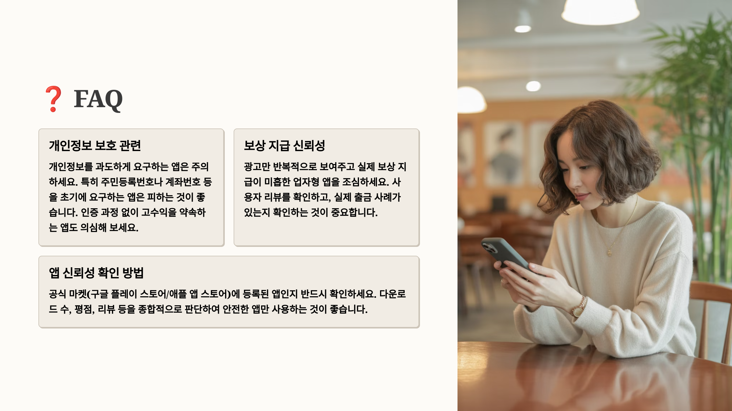가장 조심해야 할 것은 '선입금' 요구 앱이에요. 정상적인 앱테크 앱은 절대로 사용자에게 먼저 돈을 요구하지 않아요. "프리미엄 회원이 되면 더 많은 수익을 올릴 수 있다"거나 "초기 투자금이 필요하다"는 식으로 접근하는 앱은 100% 사기예요. 실제로 5만원을 내고 가입했다가 앱이 사라져버린 피해 사례가 많답니다.