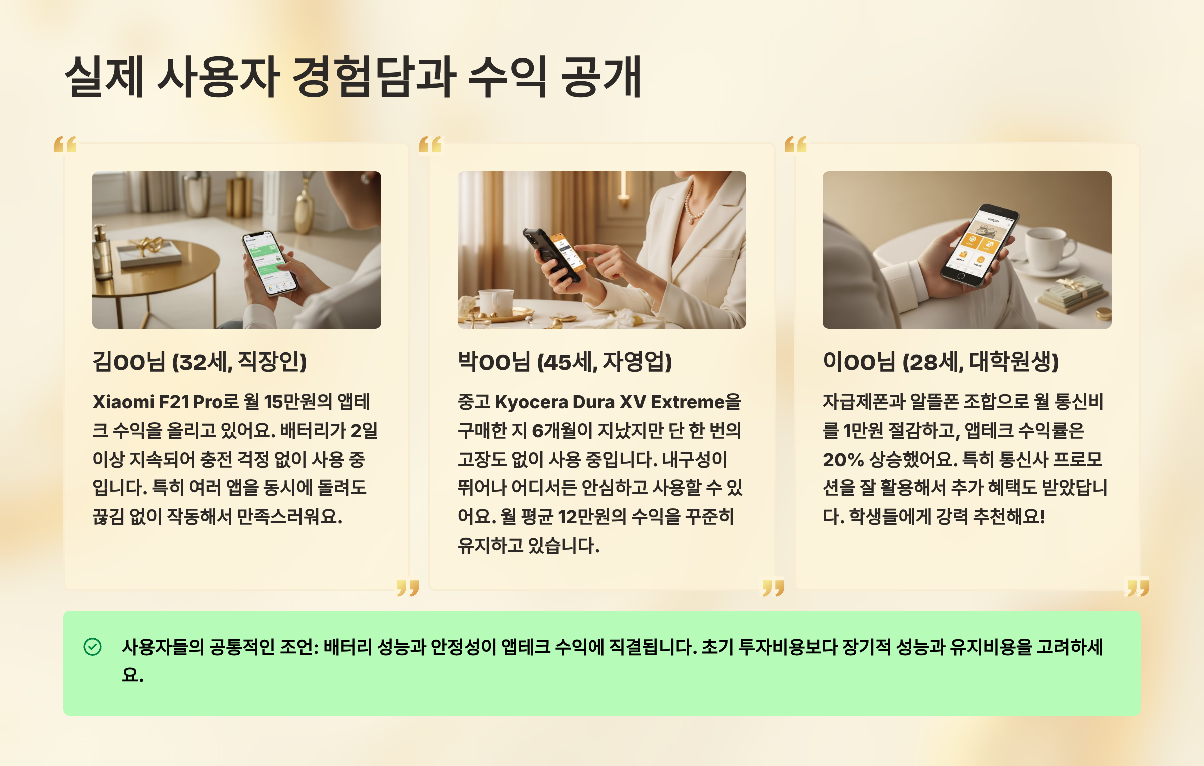 실제로 앱테크를 하고 있는 분들의 생생한 후기를 들려드릴게요! 💬 A씨는 LG Q31을 7만원에 구매해서 6개월째 사용 중이에요. "처음엔 버벅임이 걱정됐는데 출석체크나 광고 보기는 문제없어요. 월 평균 4만원 정도 벌고 있어서 2개월 만에 본전 뽑았어요!"라고 하네요.