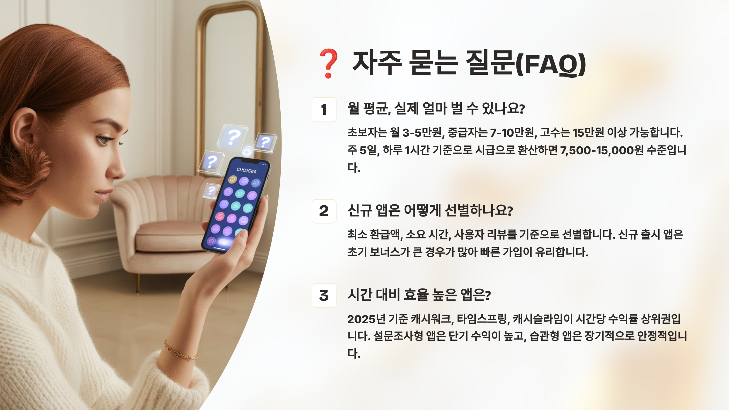 A15. 어차피 버려지는 자투리 시간을 활용하는 거라 시간 낭비는 아니에요. 지하철에서 SNS 보는 대신 앱테크를 하면 돈도 벌고 시간도 생산적으로 쓸 수 있죠. 다만 본업에 지장을 주거나 수면 시간을 줄여가며 하는 건 추천하지 않아요. 적절한 선을 지키는 게 중요합니다.