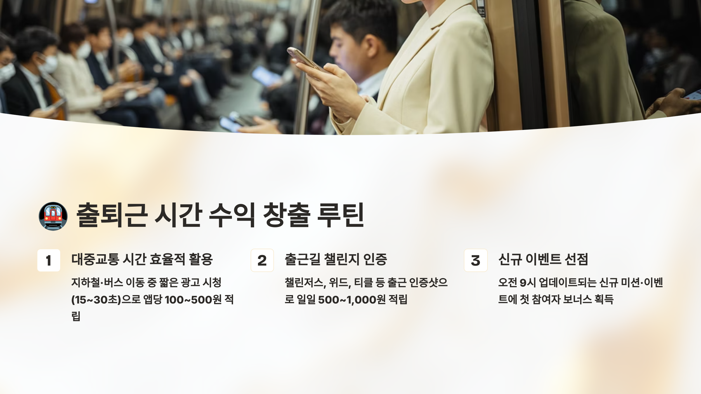 출퇴근 시간은 앱테크의 황금시간대예요! 지하철이나 버스에서 멍하니 있기보다는 스마트폰으로 돈을 버는 게 훨씬 생산적이죠. 저는 매일 왕복 2시간의 출퇴근 시간 동안 평균 1,500원 정도를 벌고 있어요. 한 달이면 무려 45,000원이나 되는 큰 금액이랍니다!