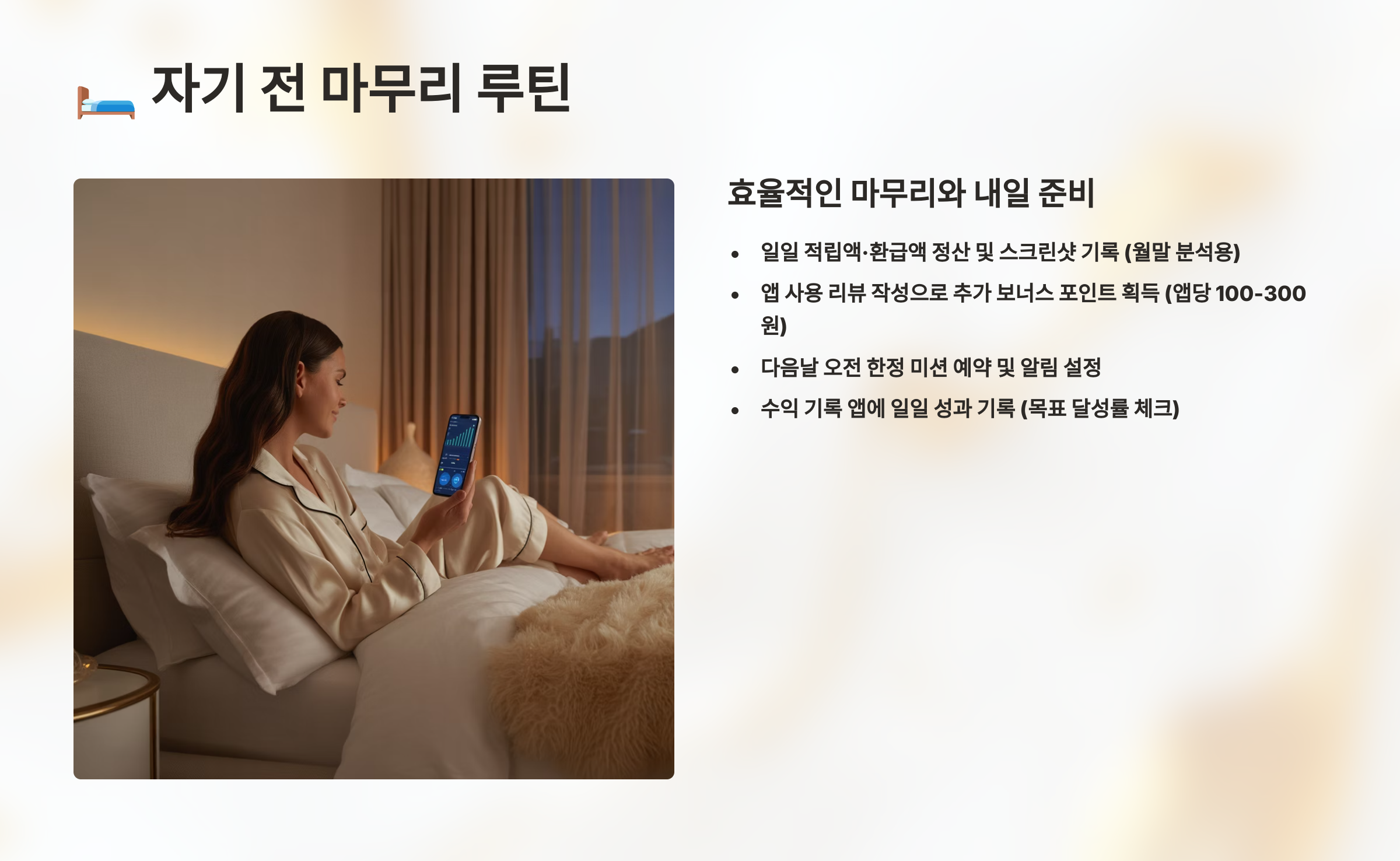자기 전 루틴의 핵심은 '간단하고 빠르게'예요. 너무 복잡하면 오히려 스트레스가 되고 꾸준히 하기 어렵거든요. 저는 이 모든 과정을 10분 안에 끝내려고 노력합니다. 침대에 누워서 스마트폰으로 간단히 체크하고, 만족스러운 하루 수익을 확인하며 잠들면 정말 행복해요!