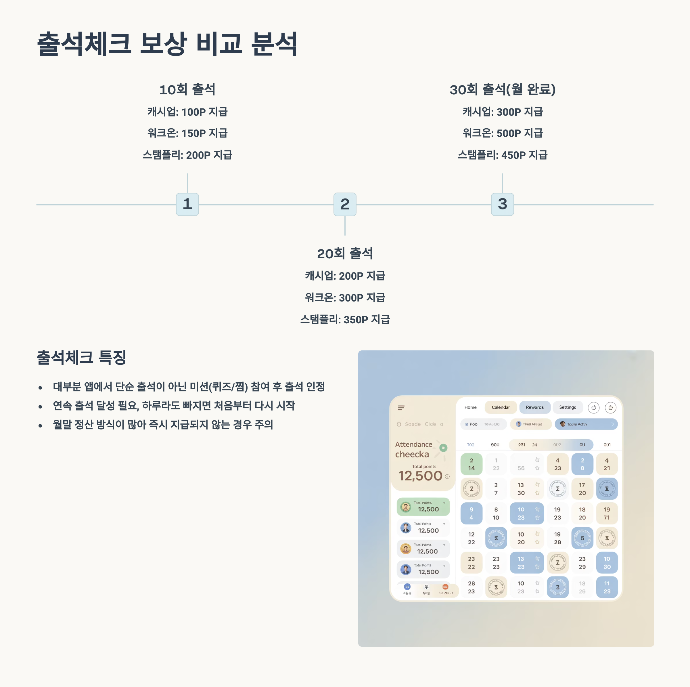 출석체크는 리워드앱의 가장 기본적인 미션이에요. 매일 앱에 접속해서 버튼 하나만 누르면 되니까 가장 쉽고 꾸준히 할 수 있는 미션이죠. 하지만 앱마다 출석 보상이 천차만별이라 어떤 앱이 더 유리한지 비교해볼 필요가 있어요.