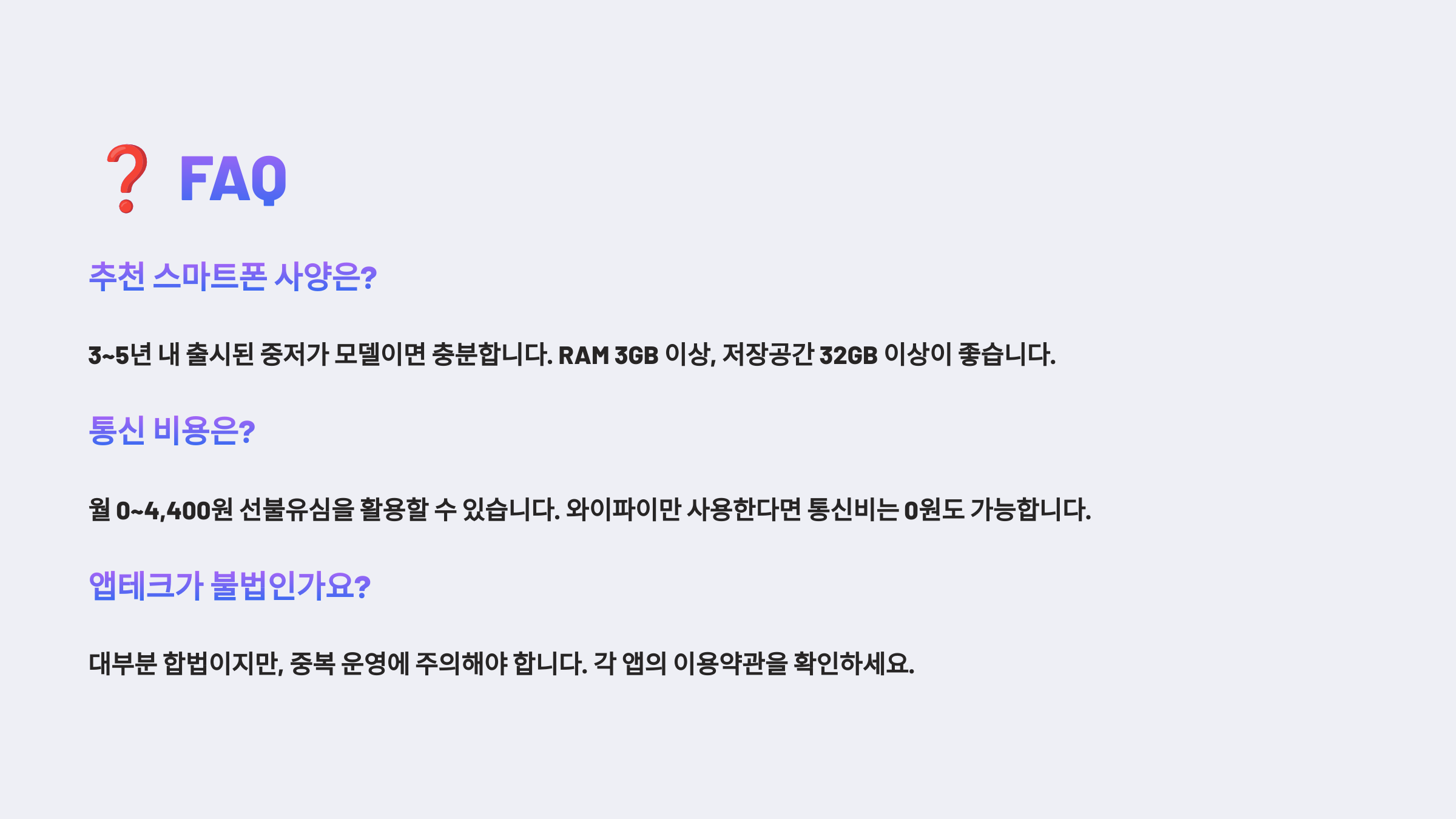 A2. 중고폰 기준으로 5-15만원 정도면 충분해요. 고성능 폰이 필요한 건 아니고 기본 사양만 되면 되거든요.