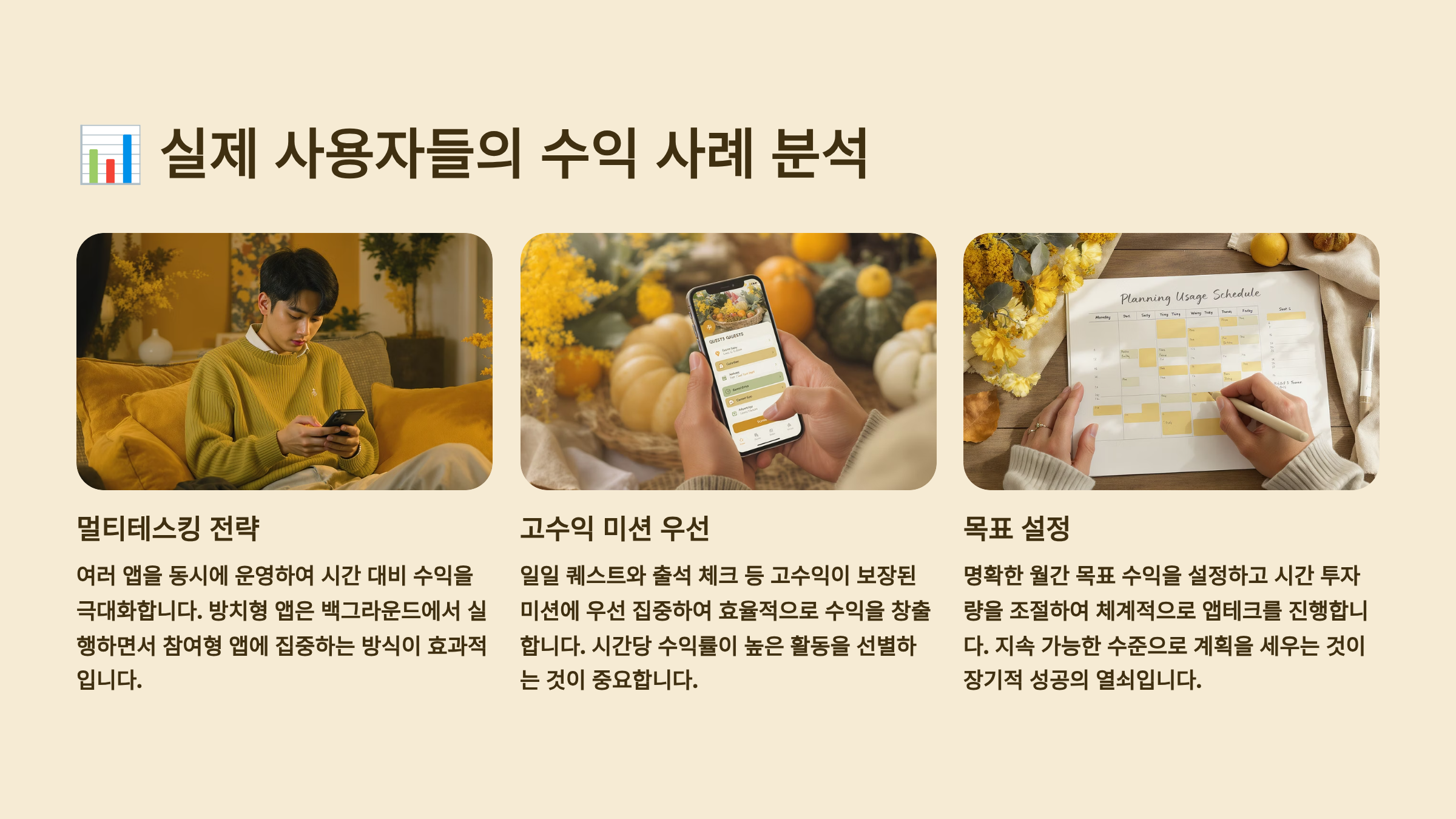 세 번째 사례는 대학생 이모 씨예요. 학업과 병행하며 월 25만원의 용돈을 벌고 있어요. 주로 강의 쉬는 시간과 공강 시간을 활용하고, 시험 기간에는 잠시 중단하는 유연한 운영을 하고 있답니다. 콘텐츠 제작형 앱에서 큰 수익을 올렸어요.