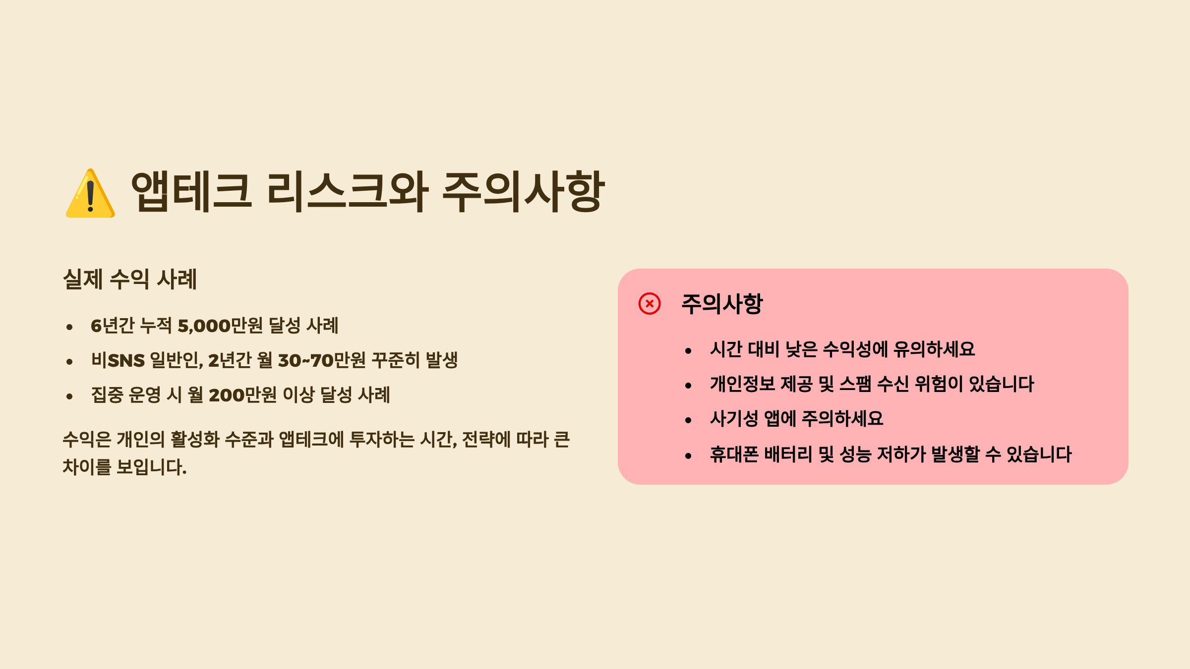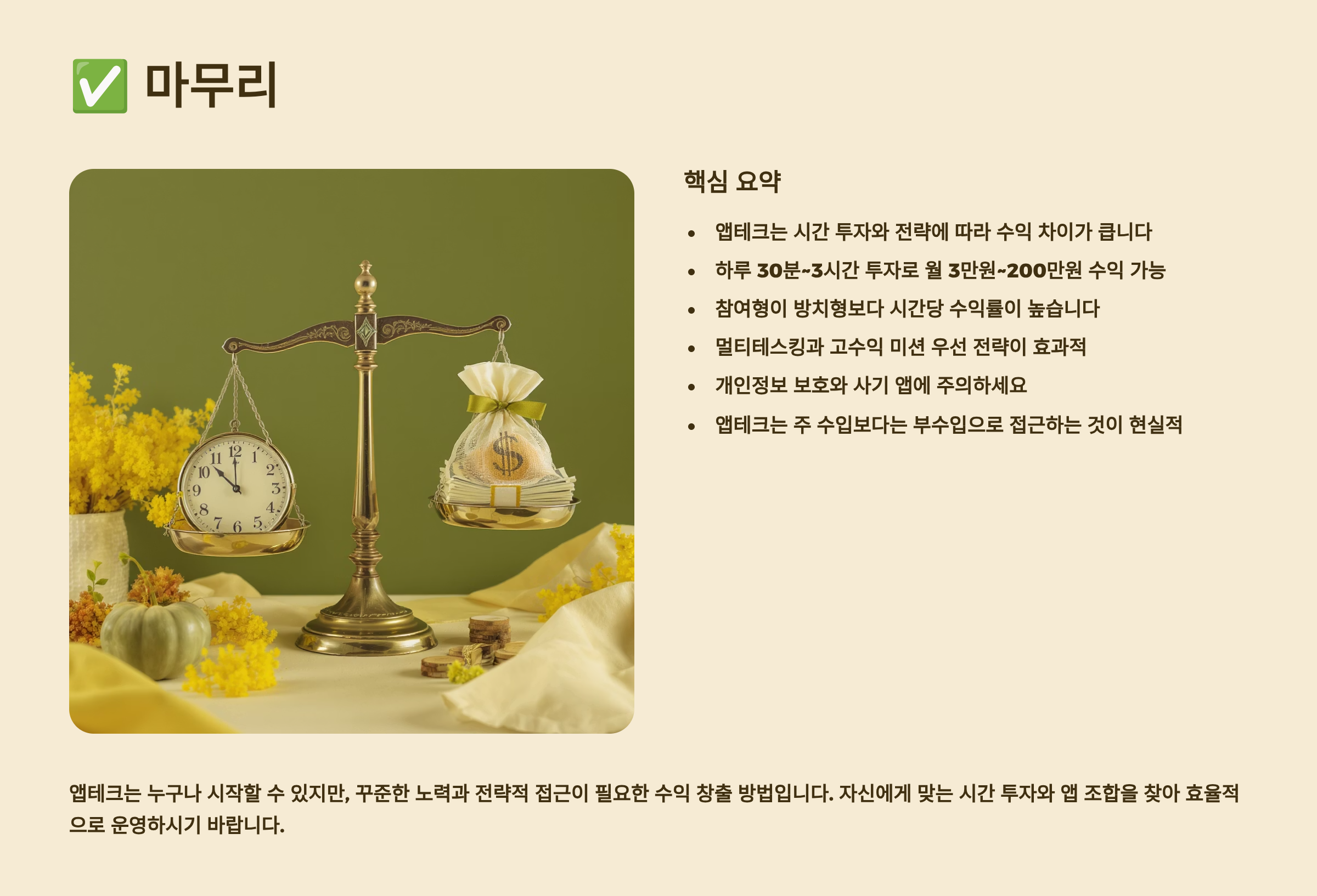 나의 생각으로는 가장 중요한 것은 '현실적인 기대치'를 갖는 거예요. 앱테크는 보조 수입원이지 주 수입원이 될 수 없어요. "월 1000만원 보장" 같은 과장 광고에 현혹되지 말고, 꾸준히 노력해서 월 30-50만원을 목표로 하는 것이 현실적이랍니다.