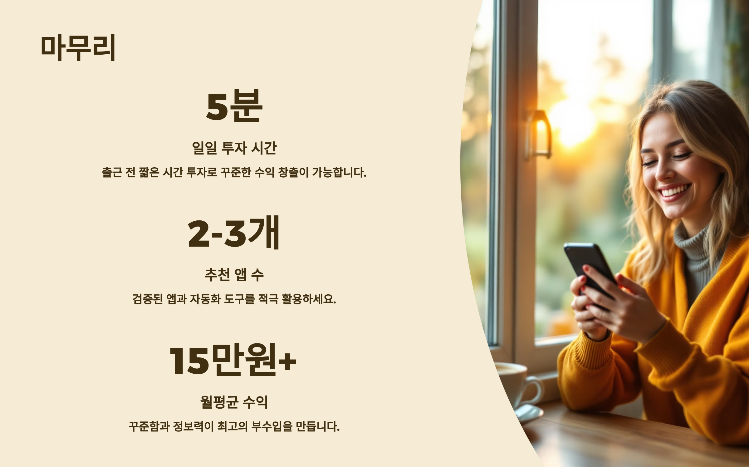 앱테크는 올바른 방법과 꾸준한 노력만 있다면 누구나 성공할 수 있는 부업이에요. 출근 전 단 5분만 투자해도 월 10만원 이상의 의미 있는 수익을 만들 수 있다는 것을 확인하셨을 거예요. 중요한 것은 욕심내지 말고 체계적으로 접근하는 것이에요.