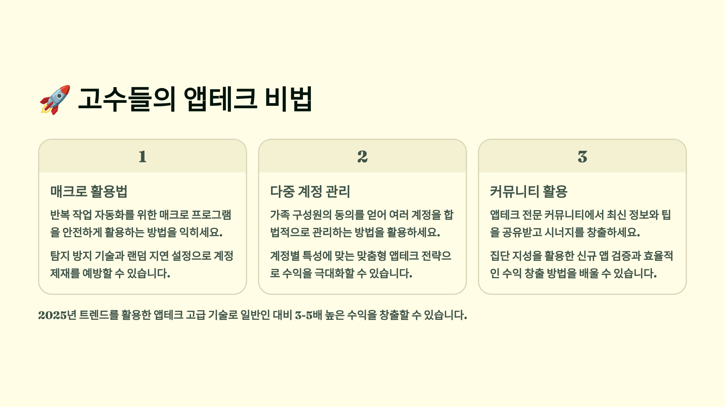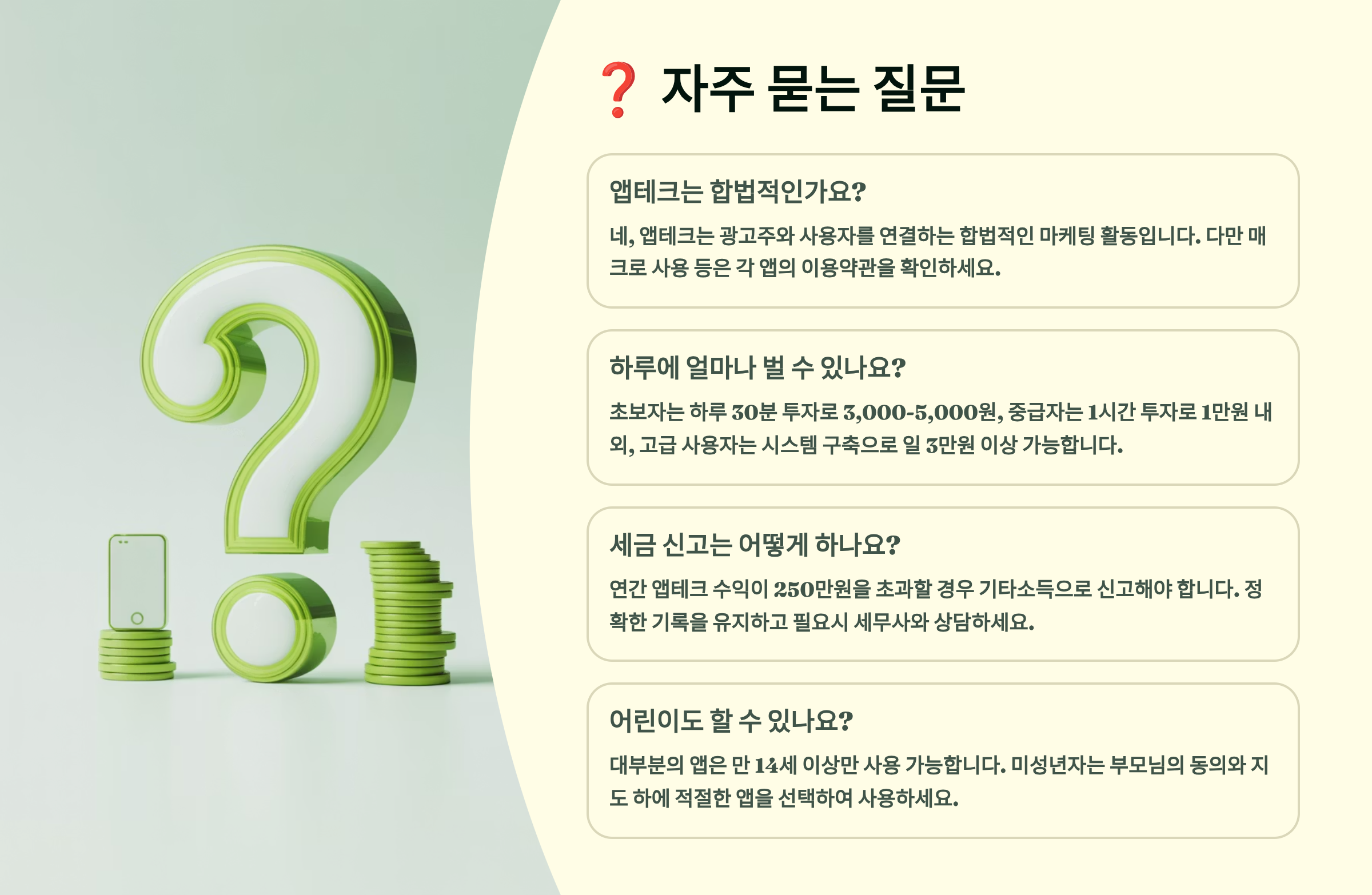 본 콘텐츠는 일반적인 앱테크 정보를 제공하는 것으로, 개인의 상황에 따라 수익은 다를 수 있습니다. 제시된 수익은 예시이며 보장되지 않습니다. 앱테크 활동 시 각 앱의 이용약관을 확인하고, 과도한 자동화는 계정 정지의 원인이 될 수 있으니 주의하세요. 세금 관련 사항은 전문가와 상담하시기 바랍니다.