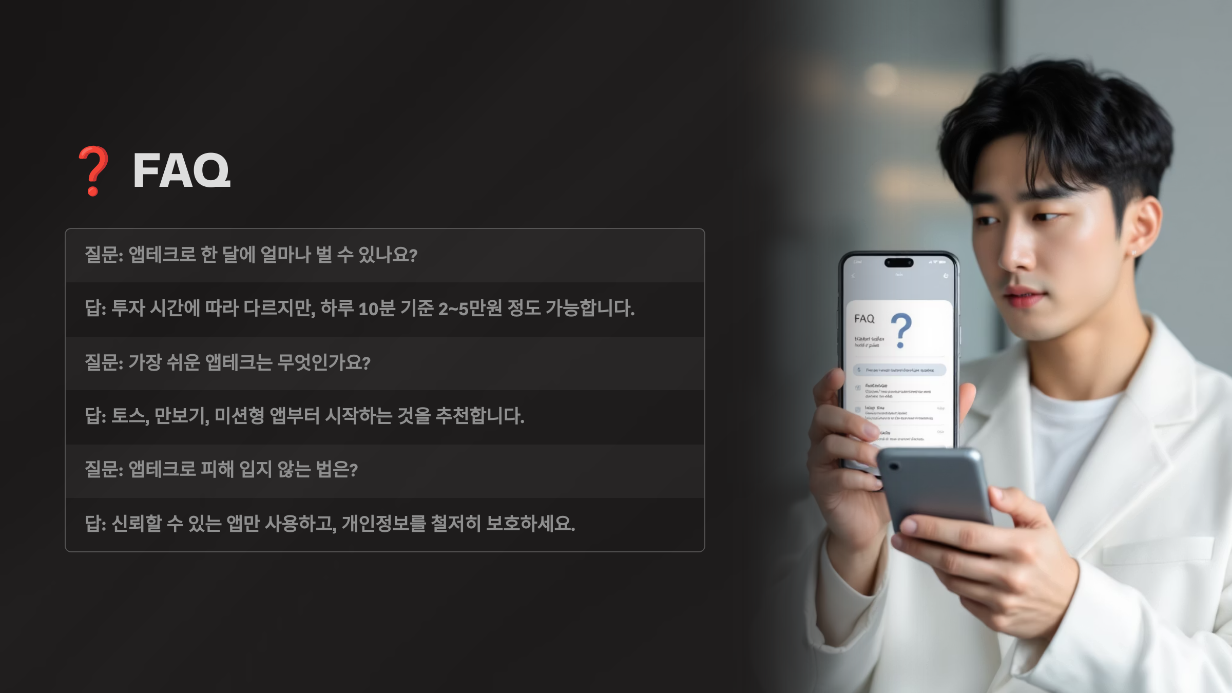 A6. 초기 투자금을 요구하거나 과도한 수익을 약속하는 앱은 99% 사기예요. 정식 앱스토어에서 다운로드하고, 개발자 정보와 사업자등록번호를 확인하는 게 기본이에요. 리뷰와 평점도 꼼꼼히 봐야 해요.