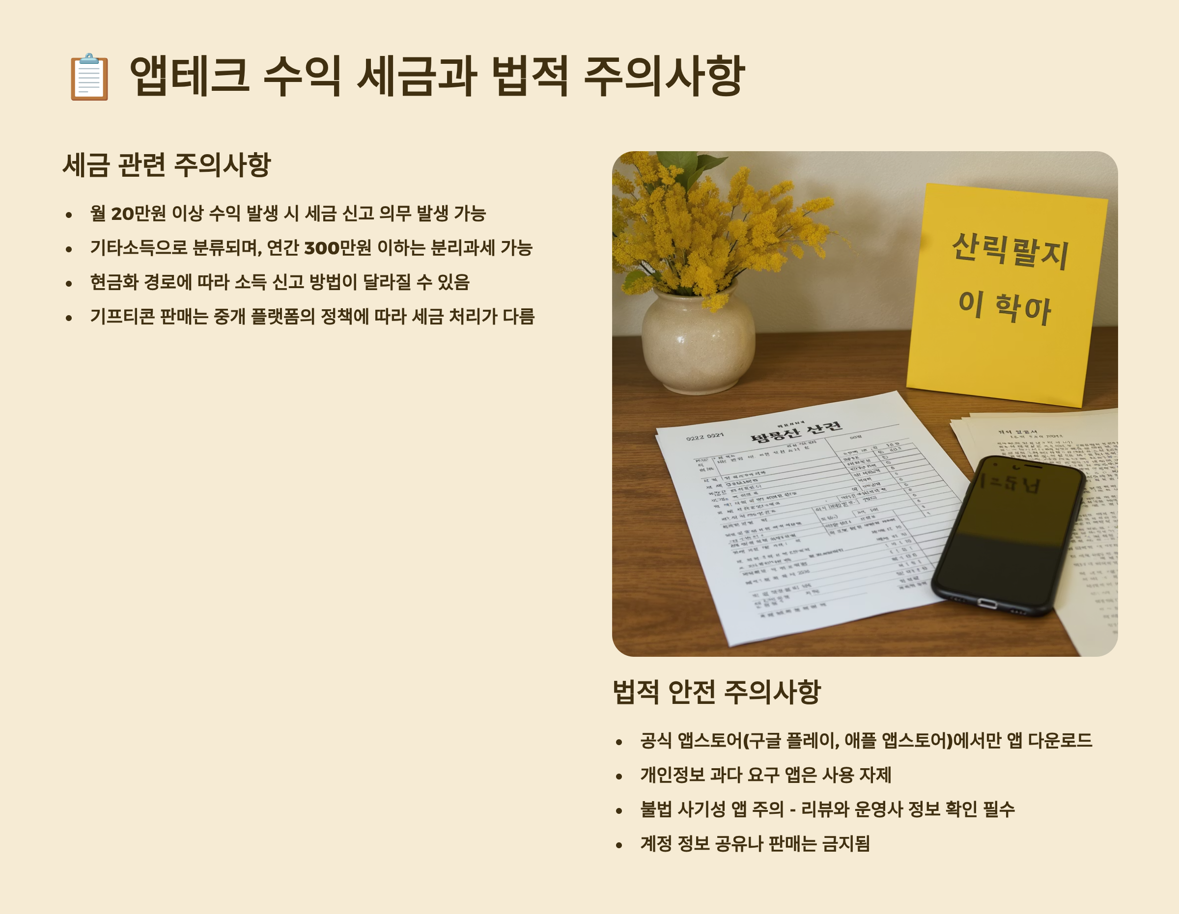 앱테크로 돈을 벌면 세금을 내야 할까요? 답은 '경우에 따라 다르다'예요. 많은 초보자들이 세금 문제를 간과하다가 나중에 곤란을 겪는 경우가 있어요. 앱테크 수익의 세금 처리 방법과 꼭 알아야 할 법적 주의사항들을 상세히 정리했으니, 미리 숙지해서 문제없이 앱테크를 즐기세요!