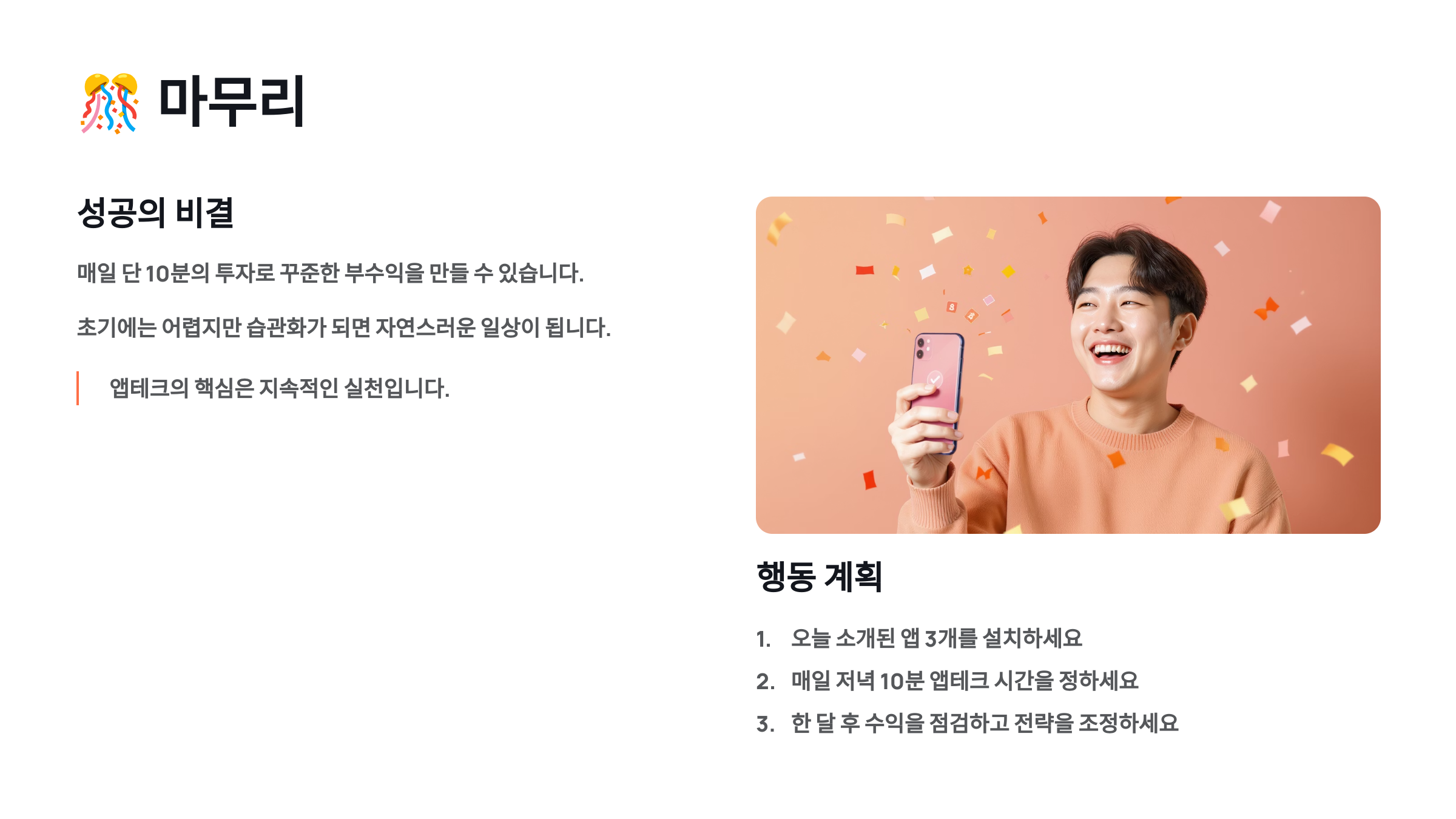 지금까지 앱테크 초보자를 위한 완벽 가이드를 소개해드렸어요. 앱테크는 특별한 기술이나 자본 없이도 누구나 시작할 수 있는 매력적인 부수입 창출 방법이에요. 하루 10분의 투자로 월 10만원 이상의 수익을 만들 수 있다는 것, 정말 놀랍지 않나요? 🎉