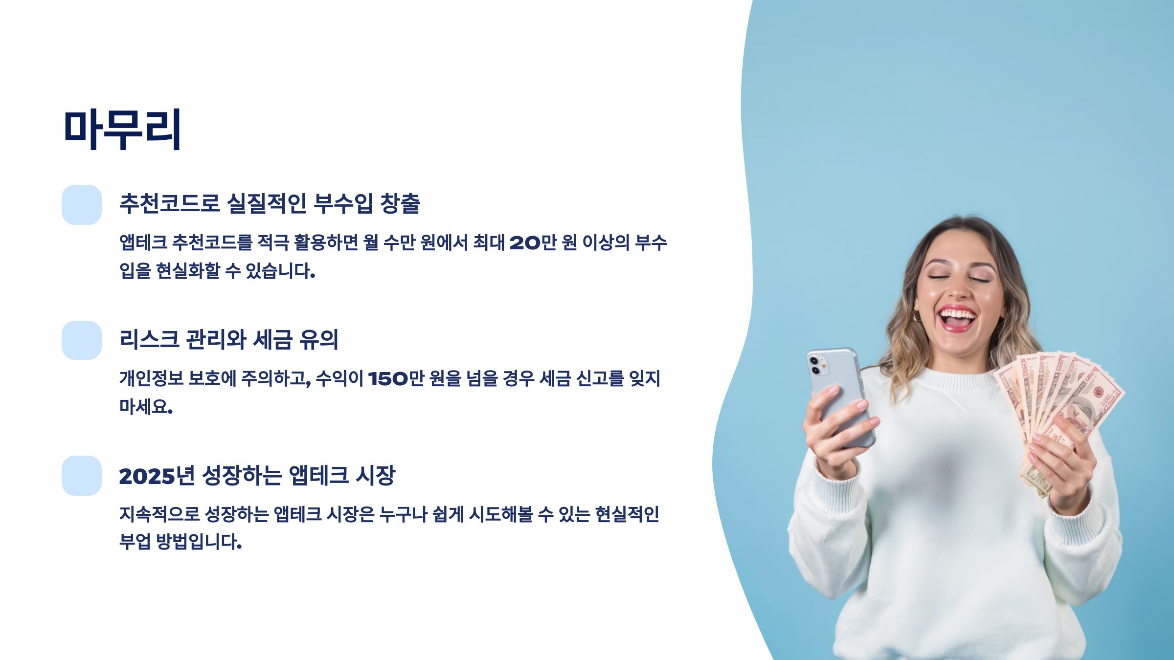본 콘텐츠에서 제공하는 앱테크 수익 정보는 개인의 경험과 사례를 바탕으로 작성되었으며, 모든 사용자가 동일한 수익을 보장받는 것은 아닙니다. 앱테크 플랫폼의 정책은 수시로 변경될 수 있으며, 세금 관련 사항은 개인의 상황에 따라 다를 수 있으므로 전문가 상담을 권장합니다. 추천코드 사용 시 각 플랫폼의 이용약관을 확인하시고, 과도한 수익 약속이나 개인정보 요구에는 주의하시기 바랍니다. 투자 및 부업 활동은 본인의 판단과 책임 하에 진행하시기 바랍니다.