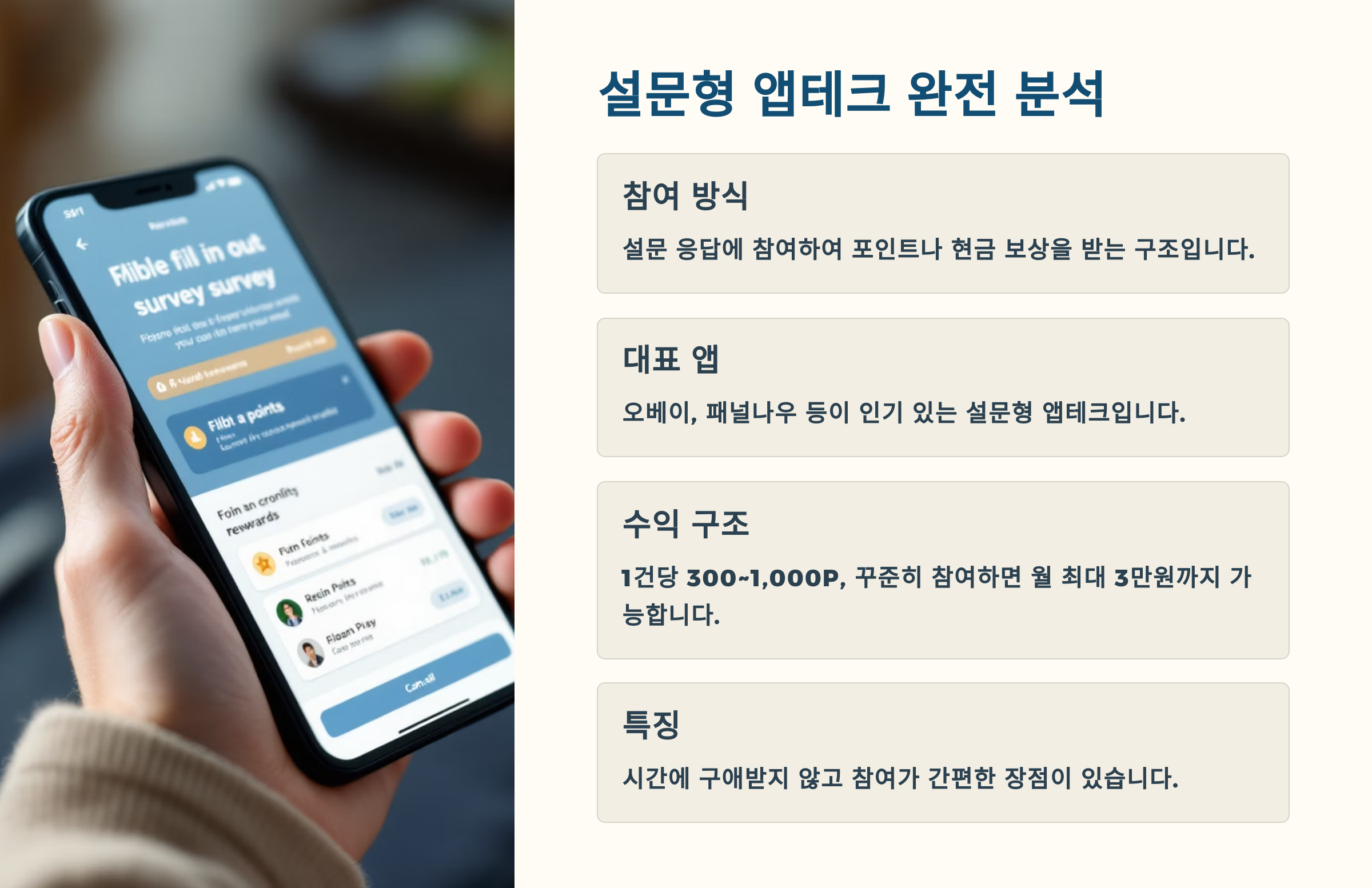설문형 앱테크의 가장 큰 장점은 안정적이고 예측 가능한 수익 구조예요. 광고형처럼 하루에 제한된 횟수가 있거나 미션형처럼 복잡한 조건을 만족해야 하는 것과 달리, 설문조사는 본인의 시간 투자에 비례해서 꾸준한 수익을 얻을 수 있거든요. 또한 설문 내용이 비교적 흥미롭고 교육적인 경우가 많아서, 시간을 보내면서 동시에 다양한 정보를 접할 수 있다는 부가적인 장점도 있답니다.