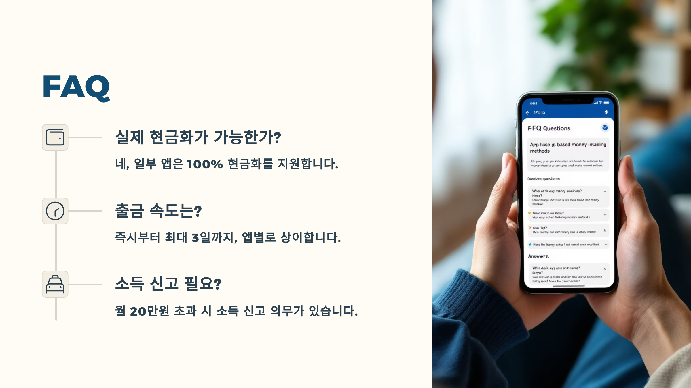 A8. 앱테크는 용돈이나 부업 수준의 수익으로 보는 것이 현실적이에요. 생활비 전체를 충당하기는 어렵고, 다른 주 수입원과 병행하는 것이 좋습니다.